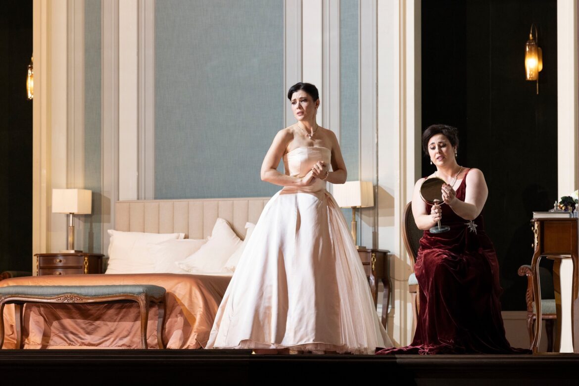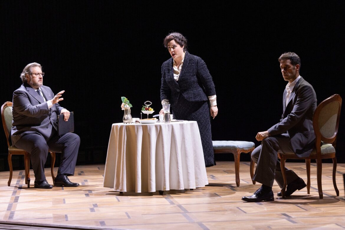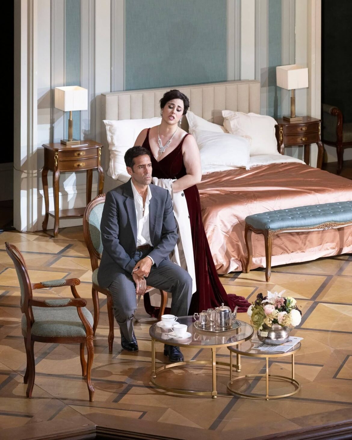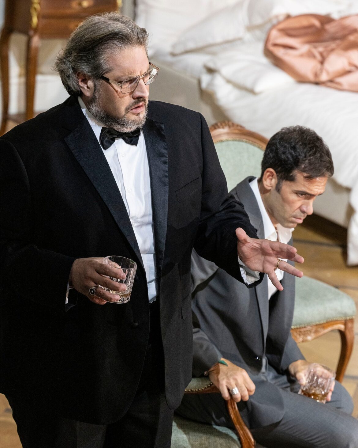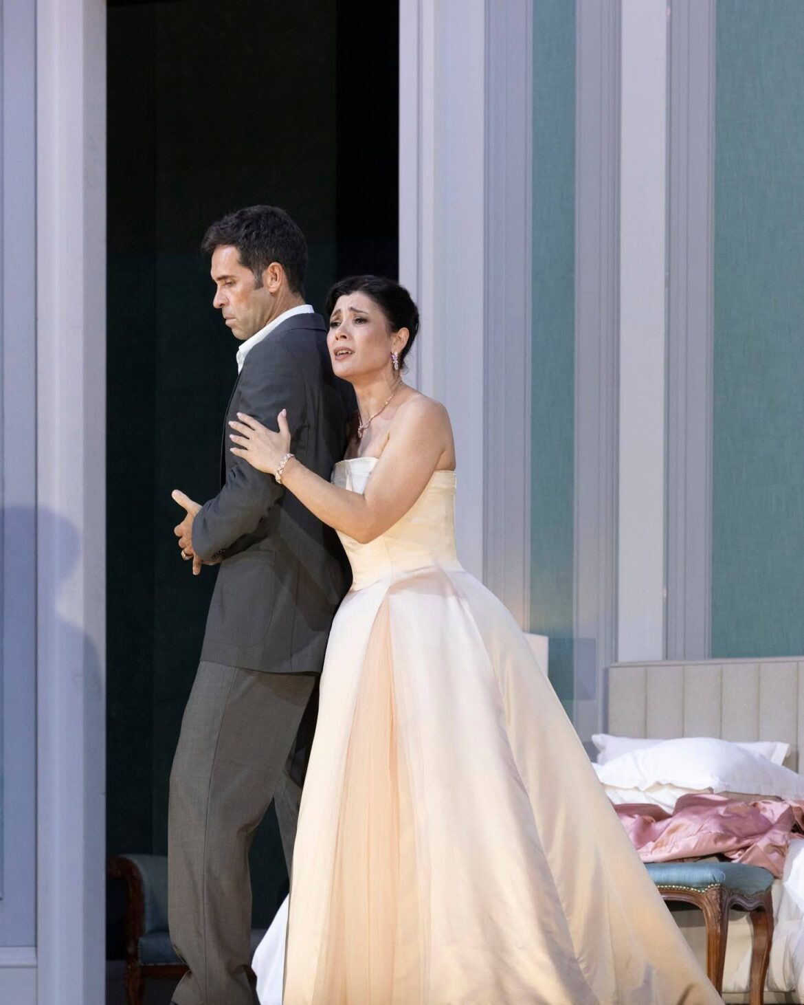 Prisonniers de ce huis clos, les quatre personnages principaux évoluent dans de jolis costumes contemporains (Klaus Bruns), alternant vêtements de ville et habits du soir, dans une plastique qui donne le même relief aux deux couples que Devereux forme tour à tour avec Elisabetta, puis avec Sara. Ismael Jordi retrouve le rôle du héros qui avait déjà été le sien aux Pays-Bas au printemps 2024 et en Espagne en juin dernier, venant à la rescousse de René Barbera, jadis Percy ici même en juin 2023, qui semble avoir désormais renoncé à cette incarnation. Brillant, son ténor lyrique se déploie aisément avec éclat dès l’affrontement avec la reine, à l’éloquence somptueuse, puis dans le récitatif préludant à la cavatine de son rival. Dans le duo avec Sara, il sait être doux dans l’agression, quoiqu’un peu appliqué, parfois plus rossinien que donizettien, cajoleur à l’envi dans ses pianissimi. Son air de l’acte III est annoncé par son irruption pendant le conflit au sein du couple ducal, quand le comte retourne dans sa prison, et s’épanouit face à tous les acteurs, y compris Elisabetta, déjà accourue sur place. Les nuances du récitatif annoncent les sentiments du cantabile, convainquant malgré un certain manque d’italianité, pour aboutir à une cabalette aérienne aux variations probantes dans sa deuxième strophe.