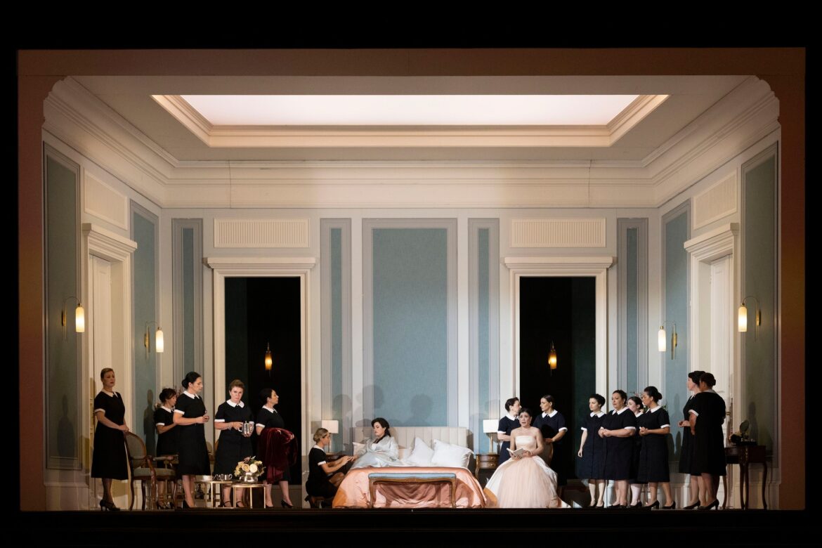 Le décor change donc du tout au tout et nous nous retrouvons d’abord dans une chambre à coucher de style très classique où trône un grand lit, pouvant à la fois se référer à la cour d’Angleterre actuelle – ou du moins à l’image que l’on peut s’en faire via les médias – ou dans un hôtel de luxe où les personnels féminins se relaient auprès de la souveraine. Une image de la brochure du San Carlo renvoie d’ailleurs à Grace Kelly dans La Main au collet (To Catch a Thief) d’Alfred Hitchcock, sans mention particulière mais en conformité avec le thriller d’amour, souhaité par Jetske Mijnssen. Ce monde oppressant qui se dessine dès l’acte II, enfermé dans les murs que Ben Baur avait imaginé pour Anna Bolena et pour Maria Stuarda, seul lien avec les deux productions antérieures, à l’exception, ajouterions-nous, des deux enfants du couple Nottingham, omniprésents dans les deux autres titres. Les deux décors se rejoignant dans la scène finale d’Elisabetta. Dans ce contexte, les chanteurs évoluent le plus souvent au milieu du plateau, sans véritable direction d’acteur.