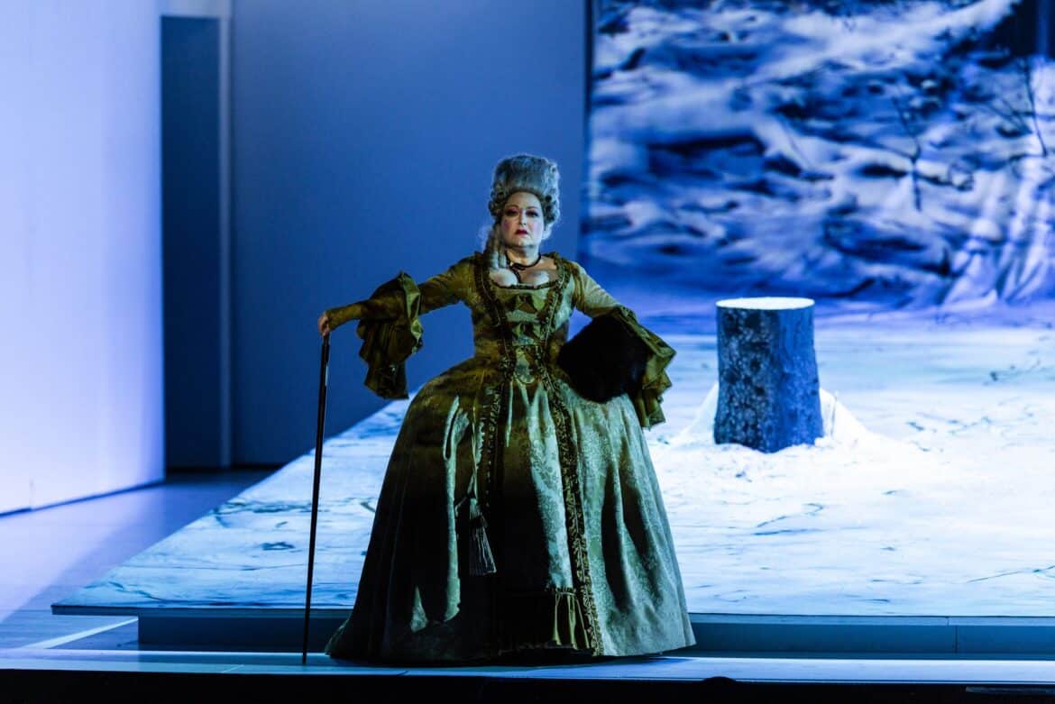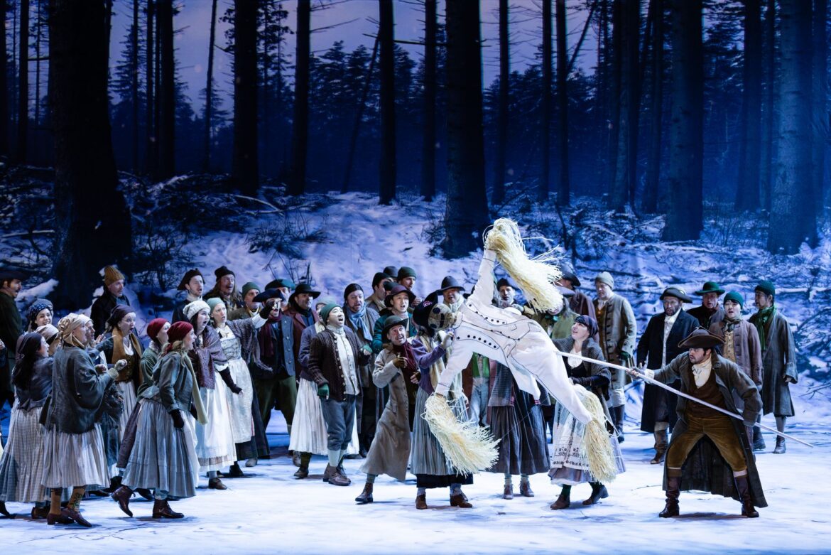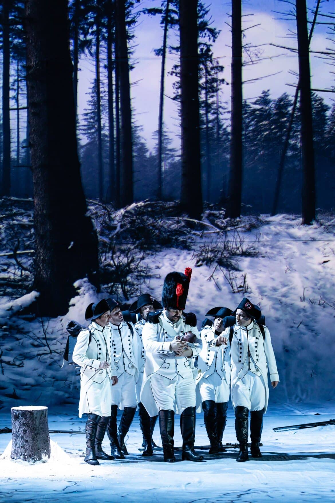 Commençons par ce dernier, pour dire que la mise en scène a été très réussie : Michieletto a créé un tableau gigantesque avec la scène comme toile de fond, les solistes et le chœur comme palette de couleurs – avec les magnifiques costumes d’Agostino Cavalca – le tout rehaussé par les éclairages dramatiques d’Alessandro Carletti. Cette équipe purement italienne a su soutenir techniquement l’idée de base du metteur en scène : celle du paysage forestier enneigé où se déroule l’intrigue, les protagonistes gagnant en intérêt visuel sur le fond blanc, qui met en valeur leur physionomie et leurs vêtements. En effet, les costumes ont été choisis soit pour s’harmoniser avec le paysage environnant (comme les uniformes blancs des soldats), soit pour créer un contraste avec des vêtements colorés et vifs, qui soulignent certains des personnages principaux. De beaux jeux visuels ont suscité un effet de surprise lorsque le chœur a surgi derrière la forêt apparemment unidimensionnelle, ou encore lorsque, dans le dernier acte, cette forêt a été représentée sur un tableau d’où le régiment a littéralement jailli, déchirant la toile – créant des moments surprenants et mémorables !