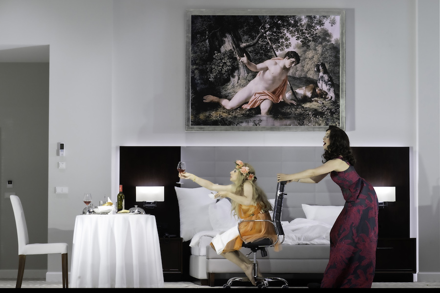 La recette de l’Hotel Metamorphosis est simple mais géniale : prenez trente des plus beaux airs écrits par le Prêtre roux, associez-les à d’autres morceaux instrumentaux (1) et, au lieu des récitatifs traditionnels, combinez les numéros musicaux avec des lectures tirées des Métamorphoses d’Ovide ou de Rainer Maria Rilke afin de créer une histoire dans laquelle les personnages de la mythologie revivent. Prenez ensuite un dramaturge, ici Olaf A. Schmitt, qui choisit le personnage d’Orphée comme narrateur, l’actrice Angela Winkler, et voilà que se recrée cette tension dramaturgique qui fait souvent défaut dans les œuvres de Vivaldi. Une opération, comme le souligne Capuano dans le programme, qui vise également à rendre les œuvres vocales de Vivaldi, qui ne font pas partie du répertoire lyrique standard, plus accessibles au public moderne, afin d’offrir une introduction captivante à l’art du compositeur vénitien.