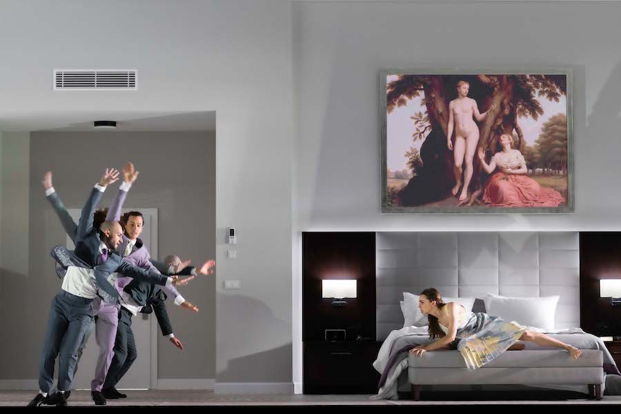 Avec les décors de Michael Levine, Kosky situe l’action dans la même chambre d’hôtel aseptisée occupée successivement par les différents personnages : au fond se trouve la porte par laquelle entrent les serveurs qui remettent chaque fois la chambre en ordre, au centre un lit et une grande fenêtre à droite. Derrière le lit, un tableau représentant à chaque fois une nouvelle scène mythologique. Klaus Bruns dessine les costumes contemporains et Franck Evin prend en charge un jeu de lumières raffiné. La vidéo graphique de rocafilm occupe une place prépondérante dans l’épisode d’Arachné. Le résultat est un spectacle visuellement époustouflant, plein d’idées originales et animé par les chorégraphies très vivantes d’Otto Pichler, réalisées par un grand nombre de danseurs exceptionnels. L’enthousiasme du public est à son comble et les rappels infinis !