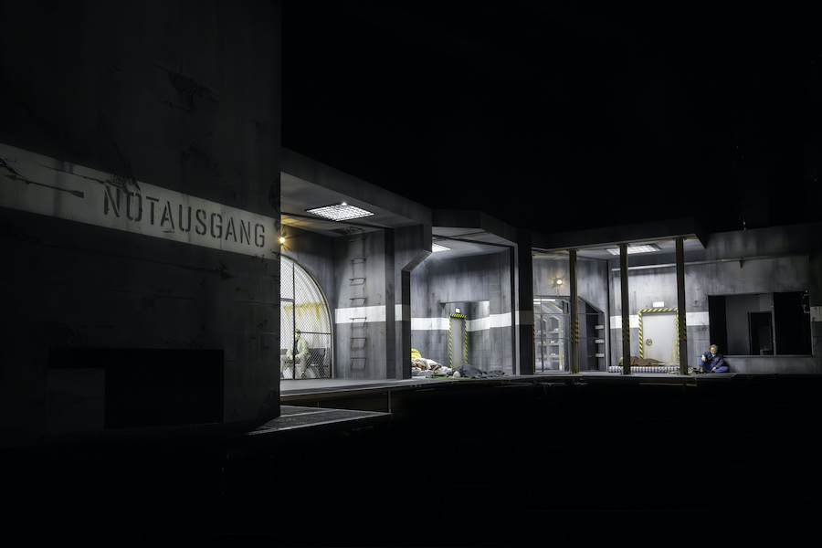 Dans ce cadre contemporain, César est un homme sûr de lui, Cléopâtre est tout d’abord une séductrice calculatrice, son frère Ptolémée un psychopathe, Cornelia une mère possessive envers le fragile et tourmenté Sextus avec lequel elle entretient une relation pour le moins complexe. Un ensemble hétéroclite d’êtres humains qui trouvent refuge dans un bunker souterrain pour échapper à une guerre qui se déroule à la surface et dont nous entendons les bombes faire trembler les murs de la Haus für Mozart et les sirènes retentir. Pour accroître l’implication du spectateur, des messages en grandes lettres rouges défilent en exhortant à chercher immédiatement un abri. En vain, les huit personnages chercheront à un moment donné une issue : tous restent prisonniers, souverains et serviteurs, vainqueurs et vaincus – même si in fine tous semblent vaincus dans leur lutte pour le pouvoir…