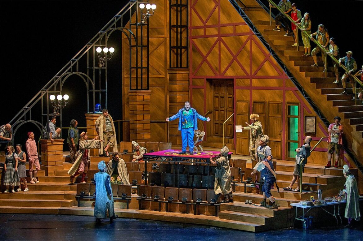 Clé du succès de la soirée, la direction d’acteurs de Matthias Davids, frappe par sa précision. Les personnages évoluent dans une symbiose évidente avec la musique, chaque geste semblant répondre à une nuance orchestrale portée par le maestro. Le burlesque est assumé, mais toujours mené avec élégance : les quiproquos, les pantomimes et les décalages visuels s’enchaînent avec fluidité. Le spectateur rit, sourit, mais perçoit aussi en arrière-plan la mélancolie qui se glisse dans l’opéra et dont Sachs est le principal dépositaire.