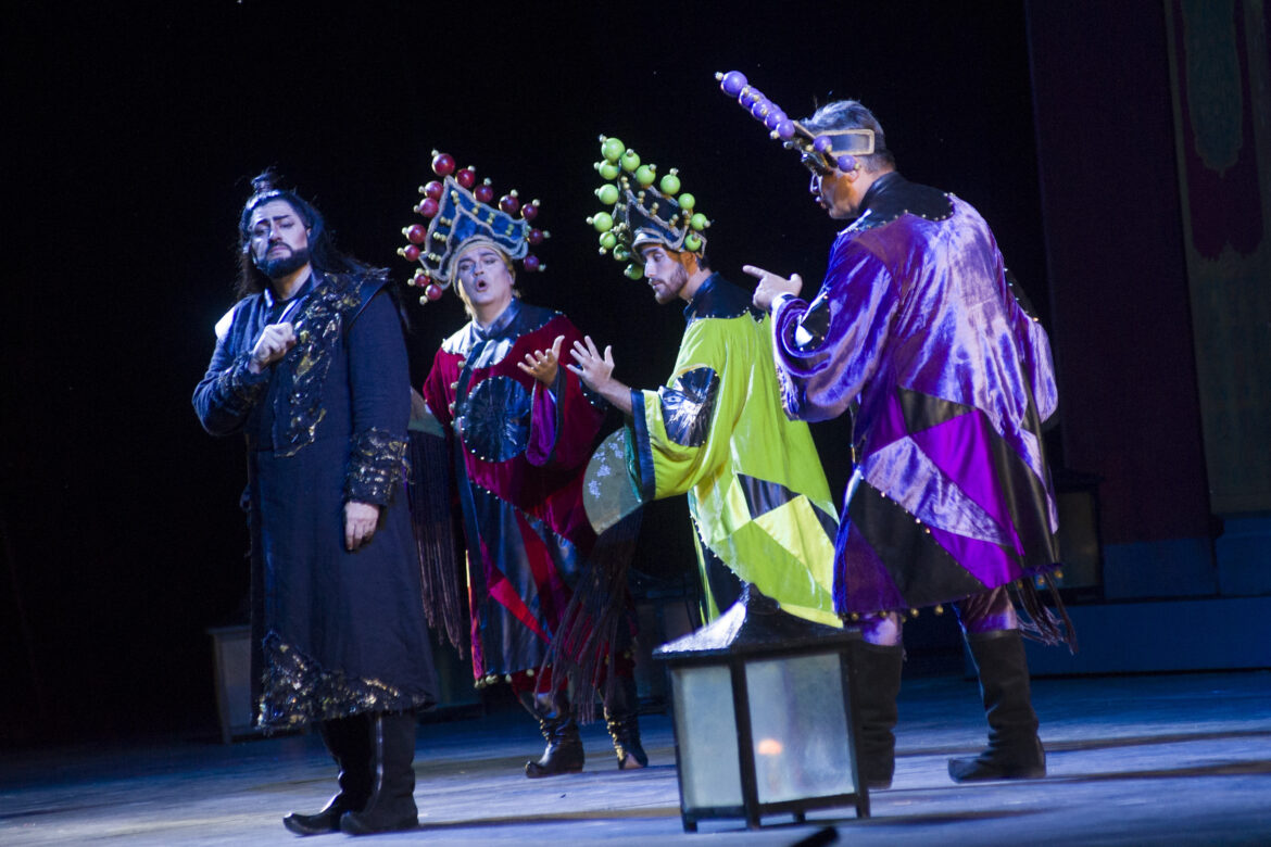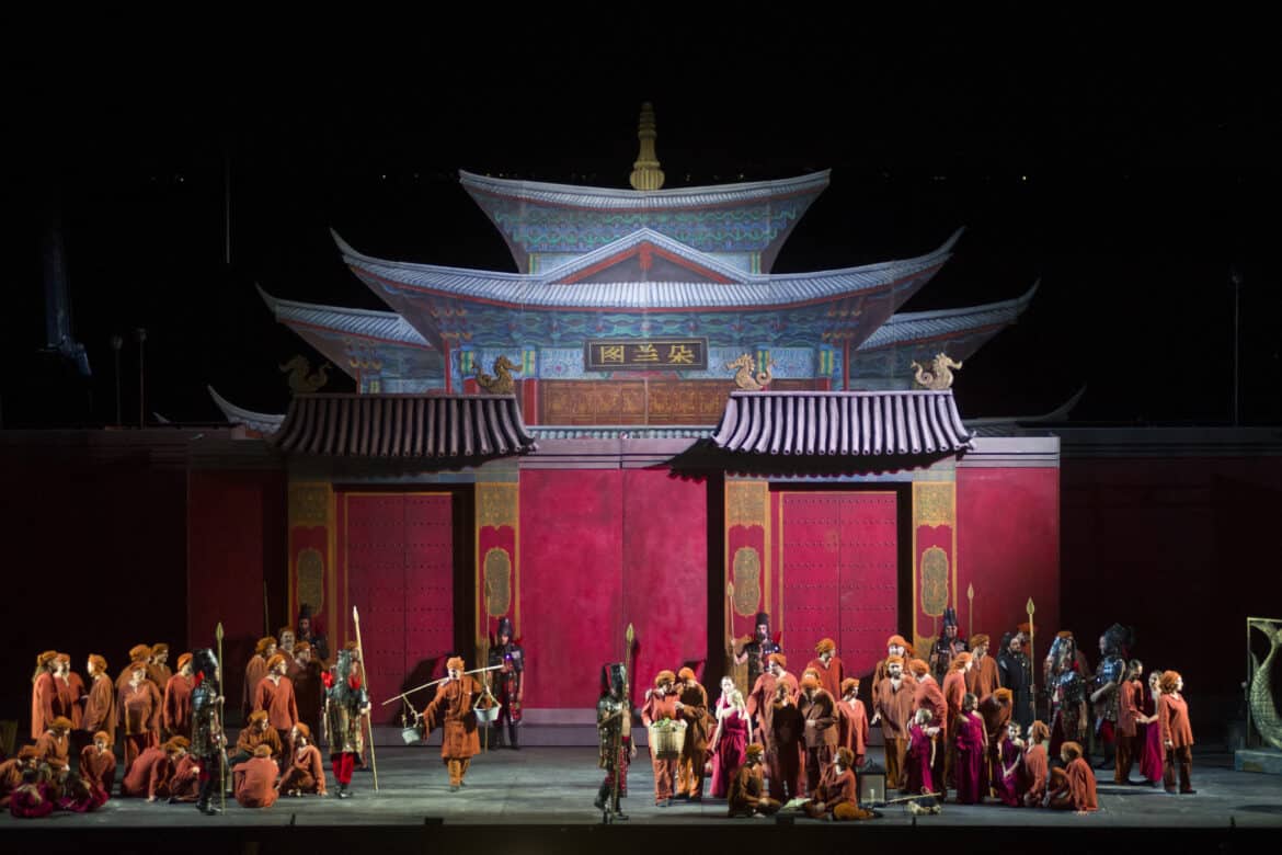 Dans une scénographie de Carla Tolomeo qui, sans donner dans la vision d’un Chinatown de pacotille, reste fidèle aux didascalies originales et donne à voir les murs massifs de la Cité impériale de Pékin avec portique, dragons et monstres inquiétants côtés cour et jardin, les mondes d’en haut et d’en bas sont intelligemment présentés au spectateur. Si l’on ajoute à ces éléments une belle harmonie de costumes, réalisés par Fausto Puglisi, aux étoffes et aux coiffes particulièrement raffinées pour les ministres Ping, Pang, Pong et pour la princesse de glace dont la traîne paraît sans fin, on ne sera pas étonné de lire que ce spectacle, loin de révolutionner l’histoire des productions de l’ouvrage, est de ceux qui se laissent regarder volontiers. 2026 étant l’année du centenaire de la création de l’ouvrage, la nouvelle production, déjà annoncée pour l’été prochain, choisira peut-être une lecture moins traditionnelle ? Dans tous les cas, il sera passionnant d’entendre le chef-d’œuvre de Puccini au miroir de la Turanda d’Antonio Bazzini (1867) et de la Turandot de Ferruccio Busoni (1917) également programmées.