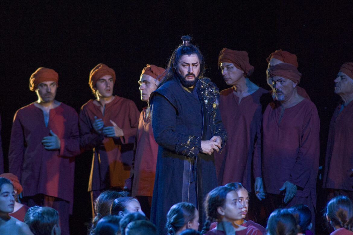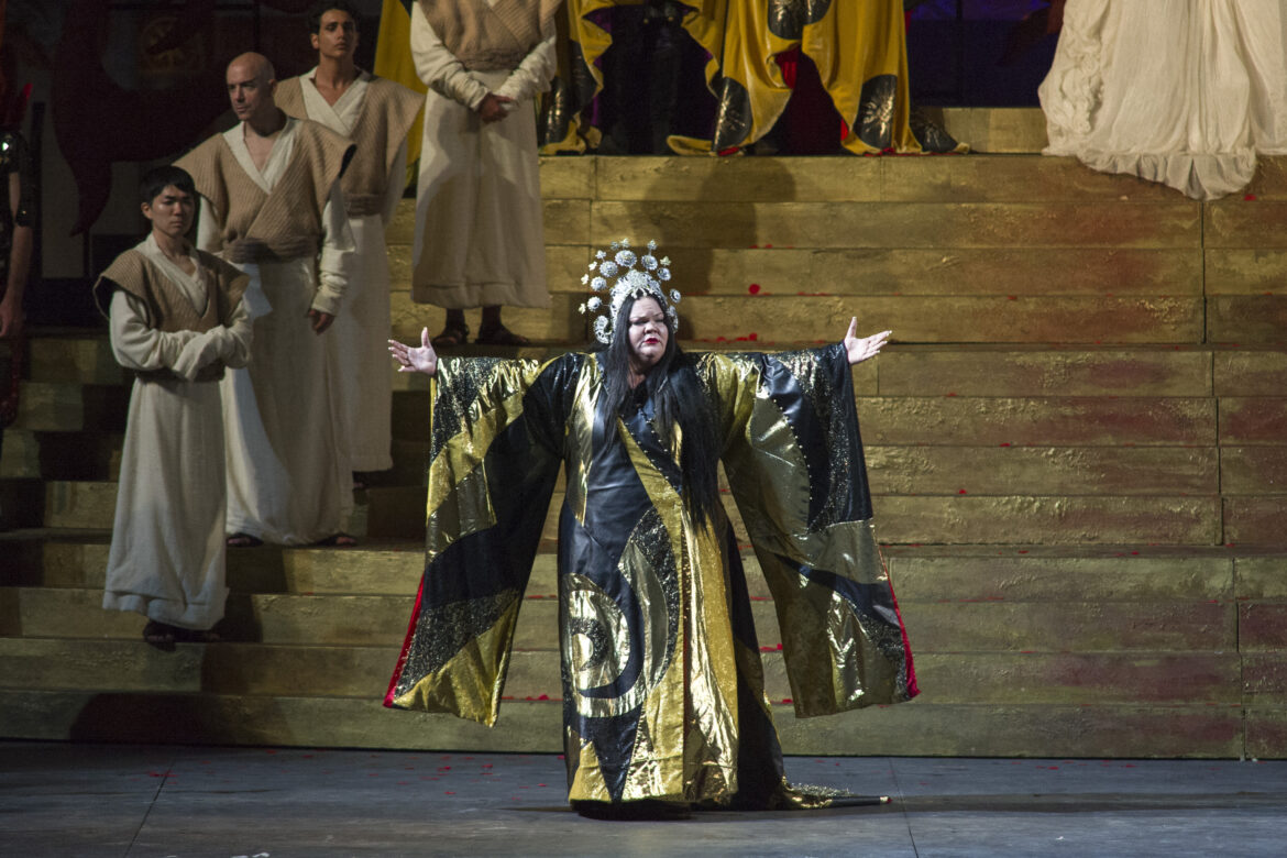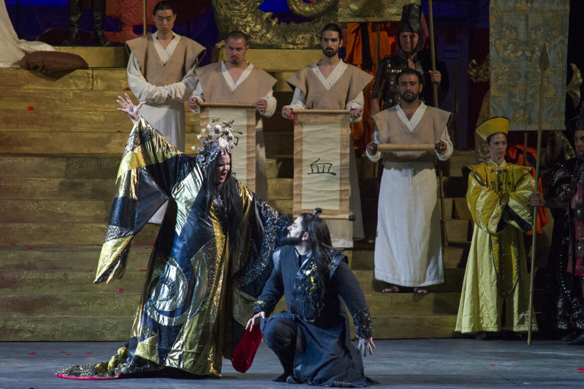 Découverte pour nous, en revanche, que la voix de la soprano américaine Courtney Ann Mills, qui avait a priori fait le buzz, pendant la crise sanitaire, avec des millions de vues sur Youtube, en chantant « Vissi d’arte » au balcon d’un palais romain, piazza Navona. Au-delà du phénomène médiatique, c’est bien une authentique voix de soprano dramatique que nous avons entendue dans le rôle-titre, et ce malgré la sonorisation du lieu qui fausse sans doute parfois un peu le calibre réel des vocalités. Doté de ce côté « sauvage » indispensable à toute grande interprète du personnage, Courtney Ann Mills parvient à bout des difficultés de son air introductif « In questa Reggia » – jusqu’au contre-ut à l’unisson avec son prétendant – puis se jette, non sans vaillance, dans la scène des énigmes, en conservant tout au long une assise vocale qui ne ploie pas. De fait, à l’issue d’un duo final où la voix de cette artiste singulière épouse assez bien les accents de stentor de son Calaf, c’est sans doute pêché véniel que d’écourter rapidement le si bémol terminal d’« il suo nome è Amor ! », même si, pour le puriste, cela laisse une impression d’inachevé, voire de voix non terminée.