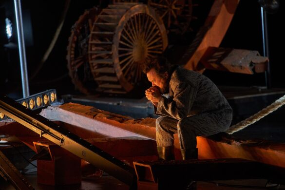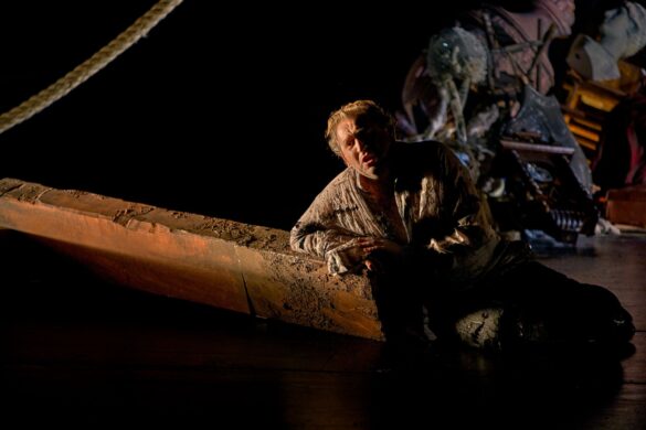 L’ultime acte s’ouvre sur une cale disloquée, réduite à ses montants, entassement d’objets au centre : un bric-à-brac de souvenirs, vestiges du passé, comme si le navire lui-même avait sombré dans la mémoire. C’est là, sur ce tas de débris, que Tristan agonise. Il est comme fondu dans ce monticule, le ramenant a un statut d’objet, presque insignifiant, noyé dans la multitude. Ce tas sera son lit de souffrance, son tombeau, son linceul. Fidèle, Kurwenal veille, silhouette sobre et digne, figure fraternelle au chevet d’un mourant.
