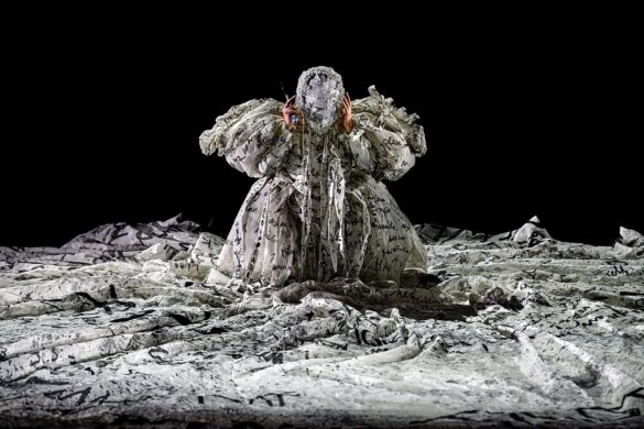 Le premier tableau est visuellement séduisant. Nous présupposons que nous sommes sur le pont d’un navire, avec de grands cordages tendus qui structurent l’espace entre verticalité et horizontalité. Là, Isolde apparaît déjà entravée dans une immense robe qui lui sert de carcan. L’effet rappelle la version Ponnelle, mais revisitée : la robe est couverte d’écritures, comme le sera le corps de Tristan au 2e acte. On y distingue des mots comme « trahison, Tantris  », signe du poids du passé qui va les lester tout au long de l’ouvrage. Les épaules semblent chargées d’un amas de papiers froissés, de brouillons rejetés : mémoire écrite, journal intime d’Isolde, passion épistolaire inavouée, peut-être même réminiscences de Schopenhauer ou de la correspondance de Wagner avec Mathilde Wesendonck. Chacun y trouvera sa vérité. Toujours est-il qu’Isolde est, dès l’ouverture, prisonnière de ce corset de mots et de souvenirs.