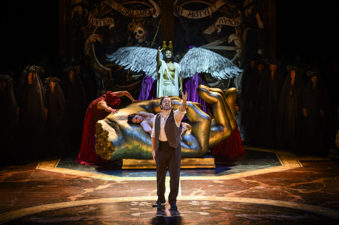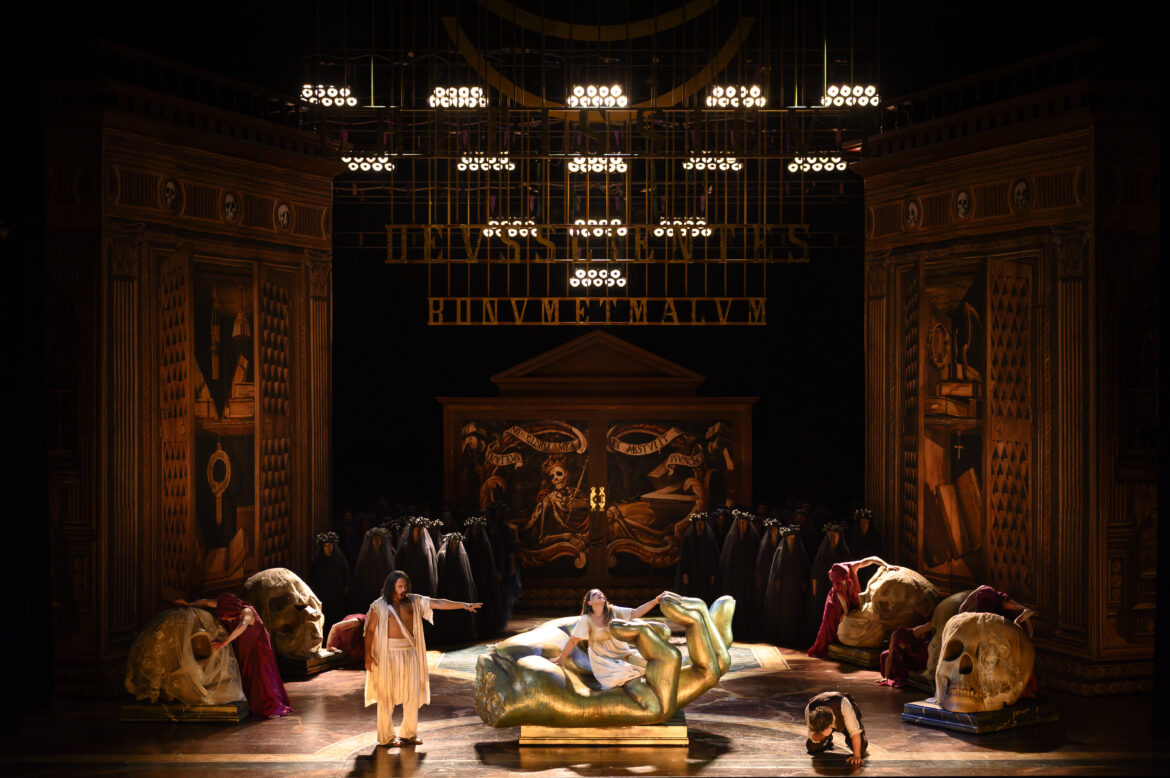 Enfin, Thaddeus Strassberger donne à voir un spectacle dont l’esthétique, là encore, se démarque heureusement des codes habituellement convoqués aujourd’hui sur la plupart des scènes lyriques, qui font trop souvent la part belle au minimalisme triste et laid. Certes, les riches costumes (signés Giuseppe Palella), les décors inattendus conçus par le metteur en scène lui-même (ils ne correspondent quasi jamais aux lieux indiqués par le livret mais font surgir maints éléments ressortissant à l’ésotérisme, voire au satanisme) donnent parfois une impression de bric-à-brac sans véritable cohérence. Mais l’idée d’inscrire les péripéties du drame dans la psyché des personnages et/ou dans l’univers diabolique que Méphisto fait graviter autour d’eux est intéressante et crée souvent une atmosphère malsaine et oppressante, particulièrement bienvenue. Certaines scènes sont par ailleurs de vraies réussites, telle celle de Marguerite au rouet, ici transposée dans ce qui semble être un hospice pour futures « filles-mères », attendant anxieusement la naissance de leur enfant. Une preuve, en tout cas, que le spectacle fonctionne : l’attention soutenue des spectateurs ne faiblit pas durant les quelque 3h30 que dure le spectacle, interrompues par un seul entracte.