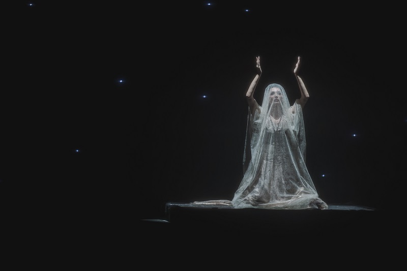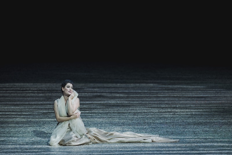 La scène reste toujours vide, un plan incliné suggérant abstraitement une plage. L’imaginaire visuel de Wenders, fait de cadrages picturaux et d’espaces suspendus, ne trouve ici aucune traduction scénique. Les couleurs lumineuses instrumentales ne se trouvent guère d’équivalents visuels sur la scène toujours sombre. L’évocation de la nuit étoilée (avec des fils lumineux), le rocher sur lequel Leïla prie (une sorte d’échelle que l’on aperçoit à peine dans l’obscurité), la scène du supplice (avec les fumées habituelles) ne sont pas plus convaincantes. Les costumes de Montserrat Casanova sont laids et invraisemblables, car pour ne rien concéder à l’exotisme, ils misent sur le monochromatisme de robes de chambre en laine pour le moins inadaptées à une île tropicale. Même les perruques posent problème dans la définition des personnages, Camarena repoussant sans cesse les cheveux noirs tombant sur son visage.