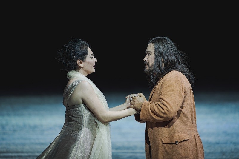 Le metteur en scène a cherché à « moderniser » le récit, en le libérant de la naïveté du livret. Mais, paradoxalement, il est tombé dans un autre type de naïveté : celle de vouloir traduire le langage de l’opéra en images cinématographiques. Le spectacle florentin s’ouvre comme un film, avec le générique projeté sur un voile semi-transparent. On voit des vagues numériques gigantesques, des lunes tropicales derrière les cimes des palmiers, des gros plans des protagonistes dans un flash-back. Tout ce que dit le livret est illustré en vidéo, avec un didactisme qui appauvrit la suggestion. Là où l’opéra évoque, le cinéma montre : et dans ce court-circuit, la magie s’éteint. On observe par ailleurs certains stéréotypes dans les gestes des protagonistes ou le traitement de la masse chorale.