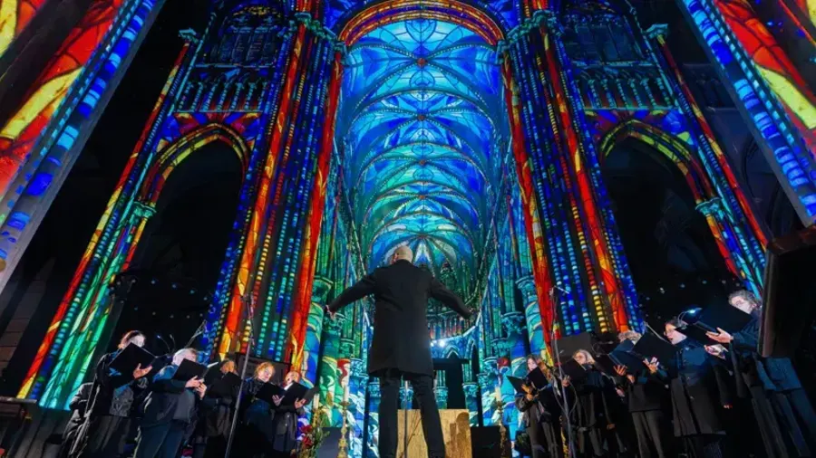 L’Ensemble vocal Focus dirigé par Bénédicte Pereira se fond dans le spectacle audiovisuel de la Cathédrale Saint-Sauveur d’Aix-en-Provence (juillet-août-septembre 2025).