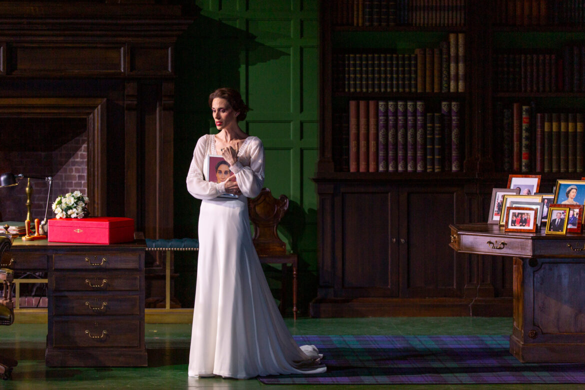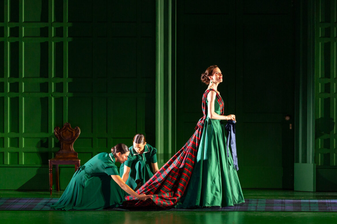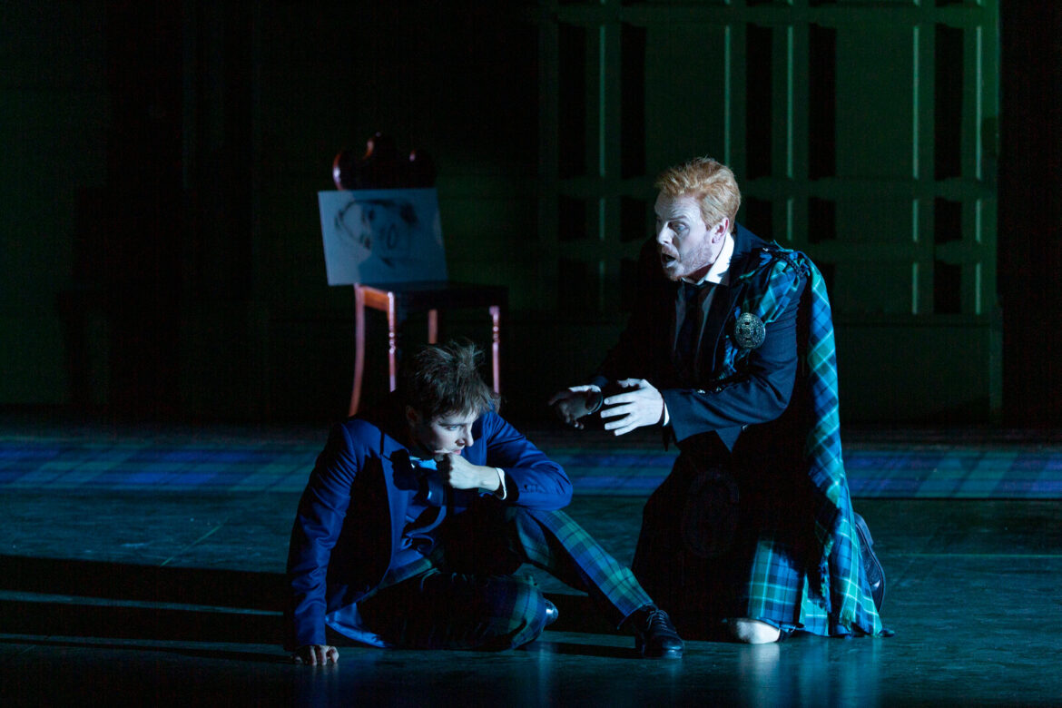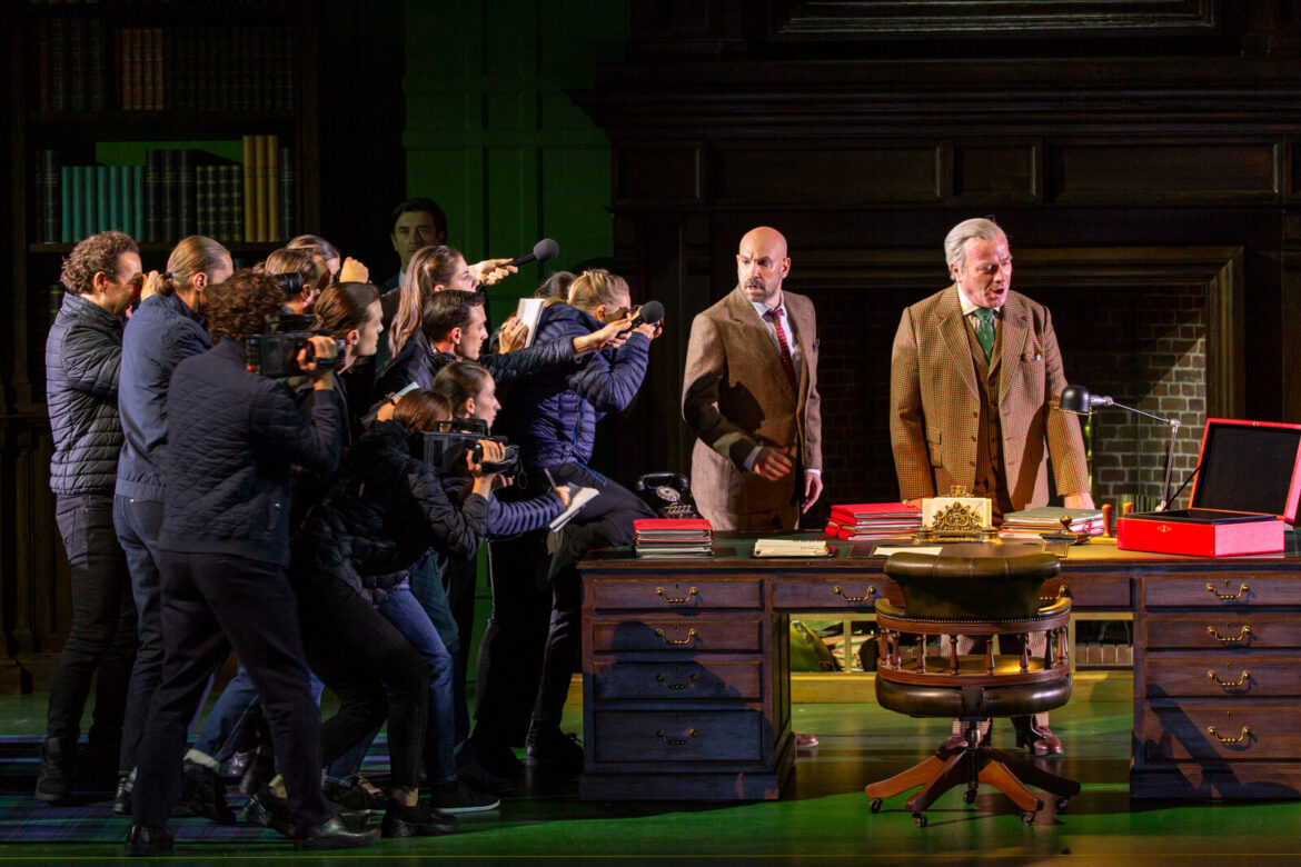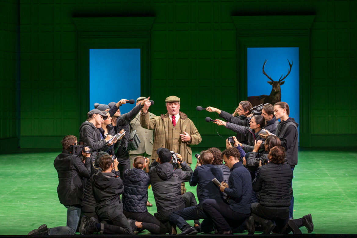 Carsen a tout peinturluré en vert – ce qui est très bon pour les nerfs, comme le savent les lecteurs de Gaston. Dans cette unité de teinte défilent la chambre à coucher de Ginevra, un extérieur où Ariodante croque son portrait, sous le regard placide des cerfs empaillés, une salle d’armes, le bureau du roi où ne manque pas, bien sûr, la boite rouge de Sa majesté. Le tout agrémenté d’autant de tartans que l’on peut souhaiter. Carsen a un peu délaissé les chaises, dont il est si friand, mais on retrouve, dans la scène finale, les potelets à cordon des musées, qu’il affectionne aussi beaucoup. On retrouve l’humour, version légère de la distance brechtienne, que le metteur en scène canadien introduit ci et là pour alléger la narration. Les déclarations du roi, le désespoir de Ginevra sont épiés par des paparazzi qui nous rappellent l’autre réalité de la monarchie britannique. Les moindres faits et gestes de la famille royale font la une de la presse à scandale. Comme pour se libérer du poids de cette institution prestigieuse, Dalinda, Lurcanio, Ariodante et Ginevra feront leurs valises à la fin du drame pour s’envoler vers une destination inconnue, laissant les visiteurs prendre des selfies dans la salle des armes devenue musée de cire. Tout est joli, frais, et surtout élégant, distingué, raffiné. C’est typiquement le spectacle où vous pouvez emmener mamie ou votre fille de 8 ans sans redouter à chaque instant qu’elles ne voient des horreurs.