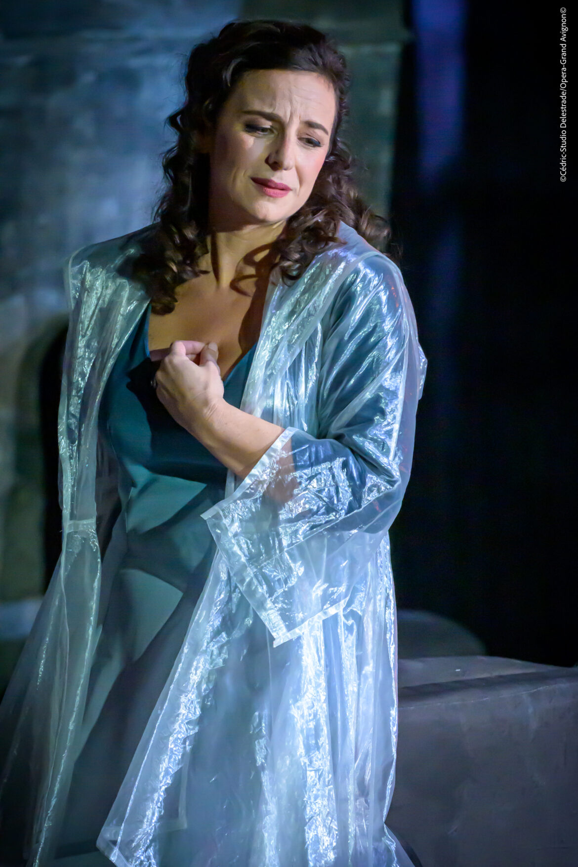 Anaïk Morel, en Donna Elvira, fait le choix d’une incarnation plus tourmentée que véhémente : son personnage, perpétuellement en mouvement, semble errer dans une pluie continue qui l’enveloppe comme un voile de chagrin. Le parti pris scénique, audacieux, souligne sa fidélité obsessionnelle et sa blessure, mais la voix, parfois contrainte dans les aigus, peine à s’épanouir pleinement dans ces tempêtes d’émotion. Gabrielle Philiponet prête à Donna Anna une fragilité nouvelle, celle d’une femme égarée entre la peur, le désir et le souvenir. Son allure, plus sensuelle que noble, bouscule les codes du rôle : curieuse de son agresseur, elle semble fascinée par le mal autant qu’elle le dénonce, allant jusqu’à désarmer son père dans un geste ambigu qui sauve Don Giovanni et la rend, malgré elle, complice de sa mort. Ce renversement donne à son personnage une ambiguïté troublante…