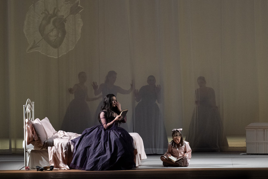 Le décor, conçu par le scénographe Alberto Beltrame et savamment éclairé par Marco Alba, se concentre dans un espace unique – la chambre de Francesca – qui devient tour à tour refuge, théâtre intérieur et métaphore de la mémoire. Tout est baigné d’une lumière qui semble venir de l’intérieur, des souvenirs de la protagoniste : au début, nous la voyons assise sur une chaise de cinéma, observant l’histoire se dérouler derrière un voile, comme sur un écran. Ce n’est que plus tard que nous la voyons entrer en action. Les doublures d’elle-même et de sa sœur Samaritana, toutes deux enfants sur scène, sont un artifice prévisible de la mise en scène moderne, mais il est ici plus que justifiable. Les costumes d’Elena Beccaro placent les personnages dans un temps suspendu, entre le Moyen Âge évoqué et la contemporanéité allusive. Bernard construit un récit visuel d’une grande élégance, ponctué de symboles et de gestes minimaux : la Samaritaine en fauteuil roulant fait allusion à sa mort entre le troisième et le quatrième acte ;  les chaussures rouges déposées au pied du lit avant le finale en disent plus long que mille mots sur la conscience du destin féminin. Son théâtre est fait d’images intérieures, de silences éloquents, de figures qui se déplacent comme dans un rêve agité : une mise en scène qui accompagne la musique plutôt que de la dominer, en respirant à son rythme.