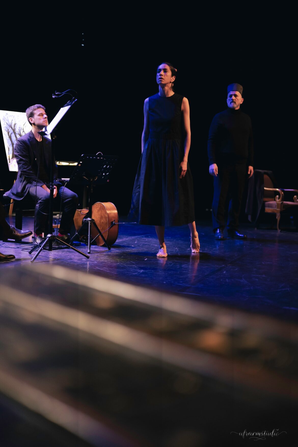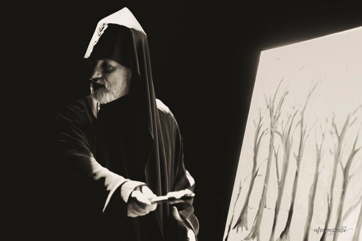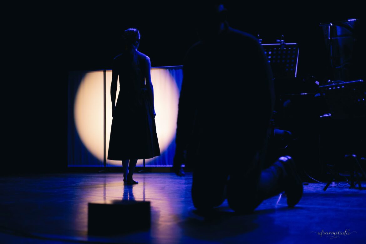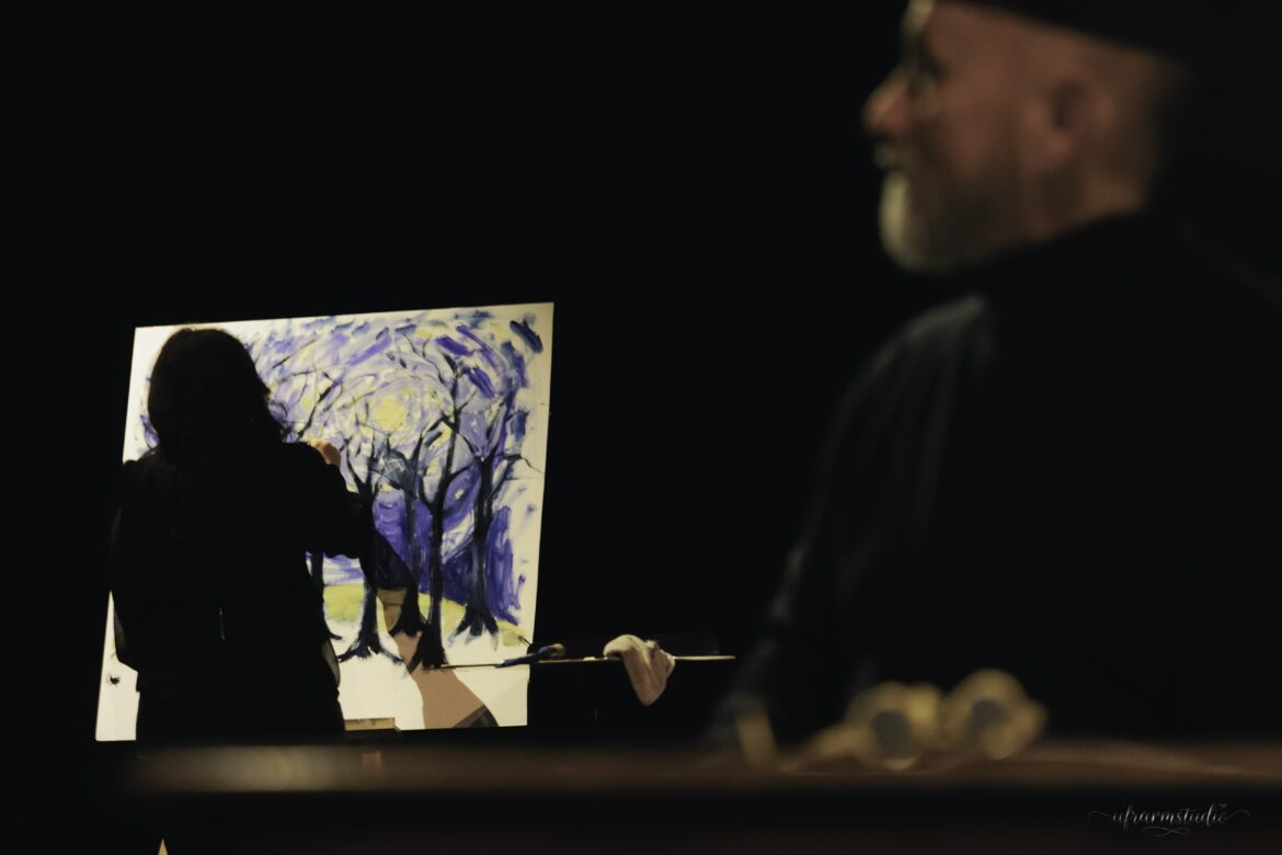 À peine monté sur scène, Komitas, incarné par le talentueux Paul-Alexandre Dubois, demande si, dans le public, ne se trouvent pas par hasard, une danseur ou une danseuse, un peintre… À leur tour, deux spectatrices se lèvent : l’une est précisément danseuse, l’autre peintre. Leur intervention parachève la vision de Komitas, qui concevait la musique comme un art total, ouvert à toutes les formes de beauté. La danseuse (Anaïs Kedikian) accompagne de ses mouvements gracieux certaines des pages musicales les plus poignantes, tandis que la peintre (Aghavni Goletsyan), sur scène, crée en direct une toile inspirée du Clair de lune de Debussy — un disque jaune cerclé de bleu, métaphore lumineuse d’un clair de lune perçant la nuit. Peu à peu, le lien entre les arts se tisse : le tronc et les branches noires des arbres sur la toile rappellent la silhouette sombre et les bras de la danseuse, tandis que la lumière jaune évoque tantôt celle de la lampe de Komitas penché sur sa table de travail, tantôt le grand cercle doré derrière lequel apparaîtront en ombres chinoises, au cours du spectacle, le corps de la danseuse puis la silhouette d’Artavazd Sargsyan interprétant une prière arménienne. Cette correspondance entre sons, gestes et couleurs incarne parfaitement l’esprit synesthésique du spectacle.
