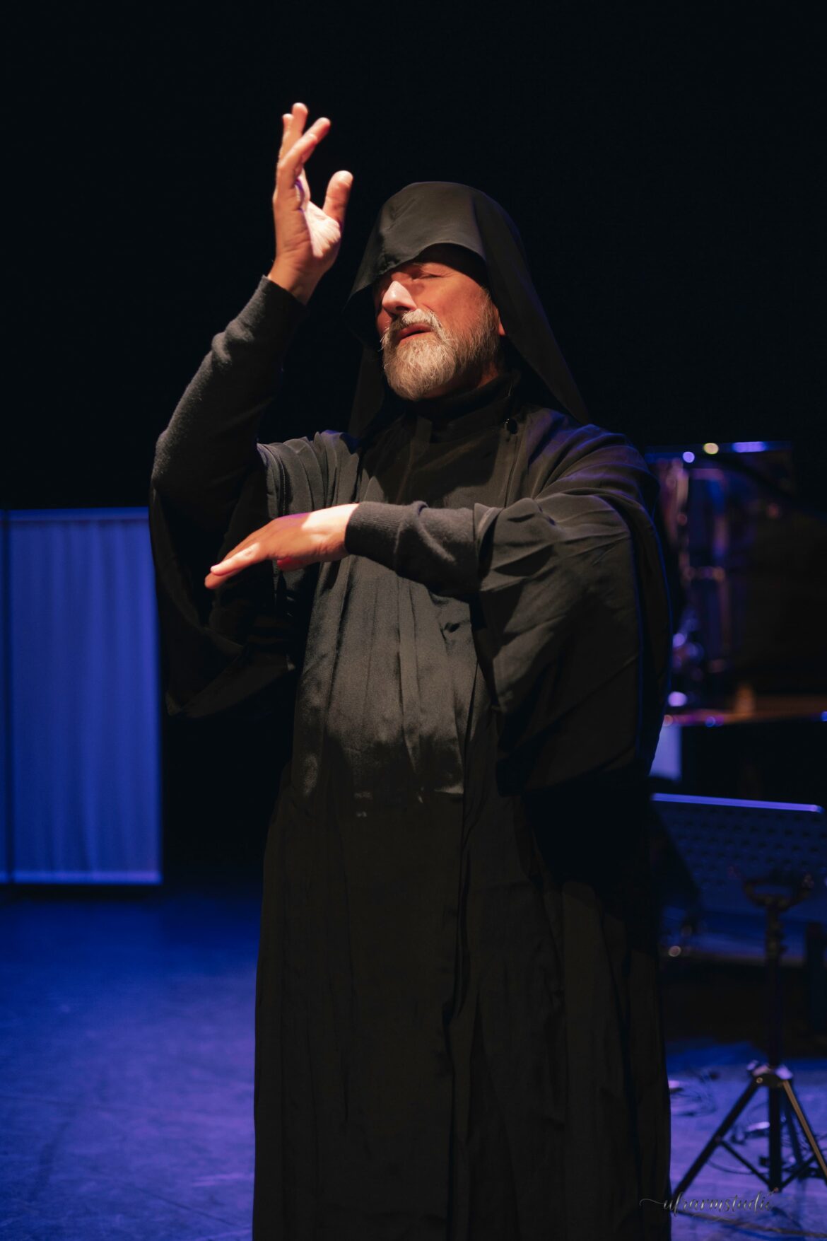 Dès l’ouverture du spectacle, la représentation surprend : le concert, à peine commencé, est interrompu par un spectateur qui prend la parole. Ce faux trouble-fête, bientôt invité sur scène, se révèle être Komitas lui-même, ou son spectre, revenu d’outre-tombe pour assister à la célébration de son œuvre et partager avec le public certaines anecdotes de sa vie mais aussi certaines de ses convictions artistiques – notamment la place essentielle que notre monde devrait accorder à l’art et à la beauté. Le ton est donné : entre fiction et hommage, entre le réel et le spirituel, la soirée prend des accents de conte poétique.