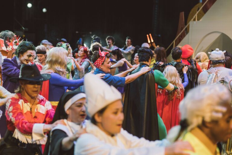 Il est donc aisé pour la metteuse en scène Nina Spijkers de jouer la corde féministe pour faire vibrer cette partition. À noter que le sénateur Giorgio Testaccio du livret original est devenu « Giorgia », et que cette sénatrice lesbienne est redoutable. Elle a des ambitions très hautes pour la ville (« Make Venice great again ») et maltraite son épouse aussi mal que le font ses collègues masculins. Comme quoi… La « mise à jour » des dialogues, version 2025, a été faite par Fabian Pfleger, et elle est assez drôle. Au festival de Mörbisch, le lac constitue un atout majeur pour évoquer la lagune de Venise, le pont du Rialto, les palais et la basilique de place Saint-Marc. Le résultat, pour la dernière production (2015), était aussi spectaculaire que bariolé. Kitsch, diraient les fâcheux. À la Volksoper, les scénographes du studio Dennis Vanderbroeck ont choisi un décor graphique, tout en blanc, d’apparence un peu austère. Mais, outre que ce décor neutre met en valeur le kaléidoscope de couleurs des costumes qui défilent sur scène, il est aussi réchauffé par les lumières de Tim van’t Hof, qui utilisent les reflets changeants de la lune pour animer la succession des tableaux. Il met aussi en valeur les chorégraphies, omniprésentes. Il est vrai que la partition regorge de valses chantées, et que le thème du carnaval s’y prête. On y sent en outre une fort intéressante contamination par le genre voisin du musical américain, qui alterne avec l’opérette à la Volksoper (on donne en ce moment My fair lady).