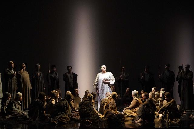 Le chœur du Théâtre municipal de Plaisance, bien préparé par Corrado Casati et dirigé par Marco Caudera, responsable des mouvements chorégraphiques, a revêtu une importance particulière, tant sur le plan vocal que scénique. À cet égard, il convient de saluer le travail minutieux de l’équipe composée du metteur en scène Roberto Catalano, de la costumière Veronica Pattuelli, de la scénographe Mariana Moreira et de la responsable des lumières Silvia Vacca, car la présence sur scène de nombreux choristes et leurs déplacements bien coordonnés ont compensé la scénographie très réduite et ont mis en valeur la dramaturgie. Les costumes – sobres, aux teintes neutres, froides et métalliques, avec une prédominance de noir pour les personnages masculins (mais bleu céruléen pour Manrico et noisette pour les gitans) et de blanc pour Azucena et Leonora – se sont révélés d’une efficacité essentielle, faisant allusion à la fois au monde médiéval et aux forts contrastes sociaux et personnels.