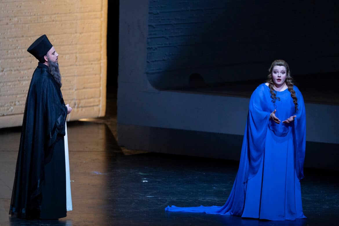 Avec Aleksandra Kurzak nous planons décidément sur d’autres sphères. Pour la soprano polonaise, il s’agit presque d’une prise de rôle, puisqu’elle n’avait jusque-là abordé la captive sacrifiée qu’une seule fois, l’été dernier, dans l’environnement bien particulier des Arènes de Vérone. Saluons donc l’impressionnant travail de préparation accompli en amont car nous assistons ce soir à une incarnation déjà très fouillée et fort aboutie en tous points. Dès son apparition, dans le bref trio avec Amneris et Radamès, s’imposent la solidité du haut du registre et une ligne maîtrisée sans condition, couronnées par des notes piquées vertigineuses. Si l’air du premier acte laisse à peine transparaître les limites de l’étendue de l’instrument, la qualité de l’élocution et un portamento exceptionnel se voient enrichis d’une variation des couleurs extrêmement expressive, afin de signifier le conflit des sentiments, entre l’amour pour son bien-aimé et les affects familiaux. Le duo avec Amneris se singularise par une grande noblesse, l’inflexion se faisant alors angélique, comme cela sied à la situation. La romanza de l’acte III conjugue à la fois ampleur, projection et soin du phrasé, les duos avec son père et son amant se distinguant respectivement par la sincérité du propos dramatique et par l’intelligence du texte. Des notes filées mémorables viennent enfin magnifier le finale III. C’est dans ces moments que l’interprétation d’Aleksandra Kurzak atteint son zénith. Cristalline dans l’épilogue du tombeau, elle insuffle à ses accents la pureté appropriée à la situation.