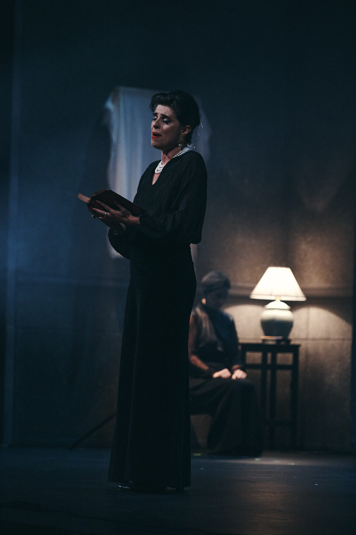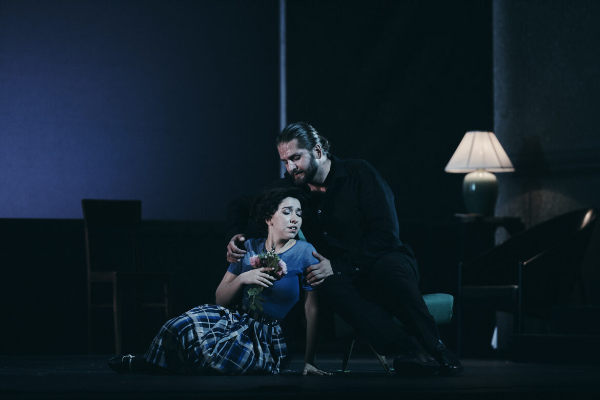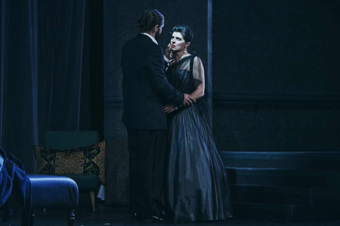 Face à ce bloc de lucidité sans pitié, Vanessa oppose un bloc d’aveuglement tout aussi fascinant. Prête à tous les compromis, elle qui attendait depuis vingt ans l’homme qu’elle aimait se résout à tomber dans les bras de sa pâle copie, sous le regard atterré de sa nièce et de sa mère. Ces vingt ans à attendre de pouvoir jouer la passion amoureuse, Catarina Molder les donne à entendre dès la première scène, lorsque Vanessa montre à Erika comment lire un extrait d’Oedipe (« Woe, woe me…»). On reste saisi par la façon dont la soprano portugaise se livre d’emblée, totalement. La même générosité s’entend quelques minutes plus tard dans le récitatif et air « Do not utter a word, Anatol… ». Deux heures durant, elle restera la signature vocale de la chanteuse, aussi à l’aise dans le registre léger que dans l’expressionnisme riche de chromatismes, plaçant la partition de Barber à la croisée de Richard Strauss, de Puccini et de la musique de film. Car le personnage de Vanessa, capable d’accès de pudeur et de fragilité, est aussi une drama queen qui ne déparerait pas dans un mélodrame à la Douglas Sirk ou à la Vincente Minnelli. Toutes ces facettes, Catarina Molder les explore avec gourmandise et sensibilité, dans une justesse théâtrale jamais prise en défaut. À l’entendre et à la voir sur scène, on se demande quelle mouche avait bien pu piquer la Callas lorsqu’elle avait refusé de créer le rôle-titre de l’opéra de Barber…