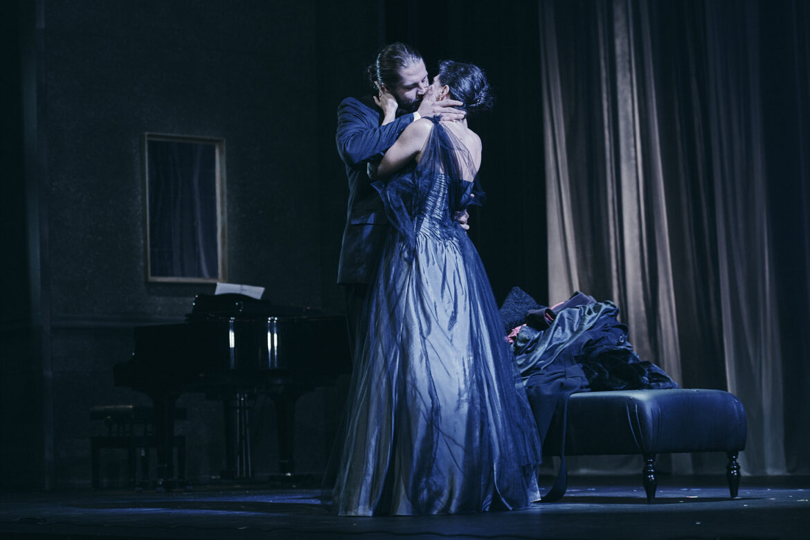 On avait aimé l’Alfredo Germont d’Ermin Ašćerić dans la Traviata donnée cet été à l’OperaFest. Il incarne avec Anatol une sorte de double inversé du héros verdien : opportuniste et calculateur, jouant sans vergogne sur les sentiments de ses hôtes. Avec des accents de sincérité d’autant plus redoutables qu’ils convainquent, dans l’air de l’acte I où il esquive les questions d’Erika (« Outside this house the world has changed ») comme dans le beau duo de l’acte II avec Vanessa (« Love has a bitter core… »). Et si la nonchalance irritante de son personnage semble céder dans l’émouvant « On the path to the lake… » de l’acte III, le répit n’est qu’illusoire : un petit jeu de scène ajouté dans le finale par Daniela Kerck souligne la nature ambiguë du séducteur qui, alors qu’il s’apprête à partir vivre à Paris avec sa future épouse, prend à part une domestique éplorée, laissant deviner quelque liaison ancillaire…