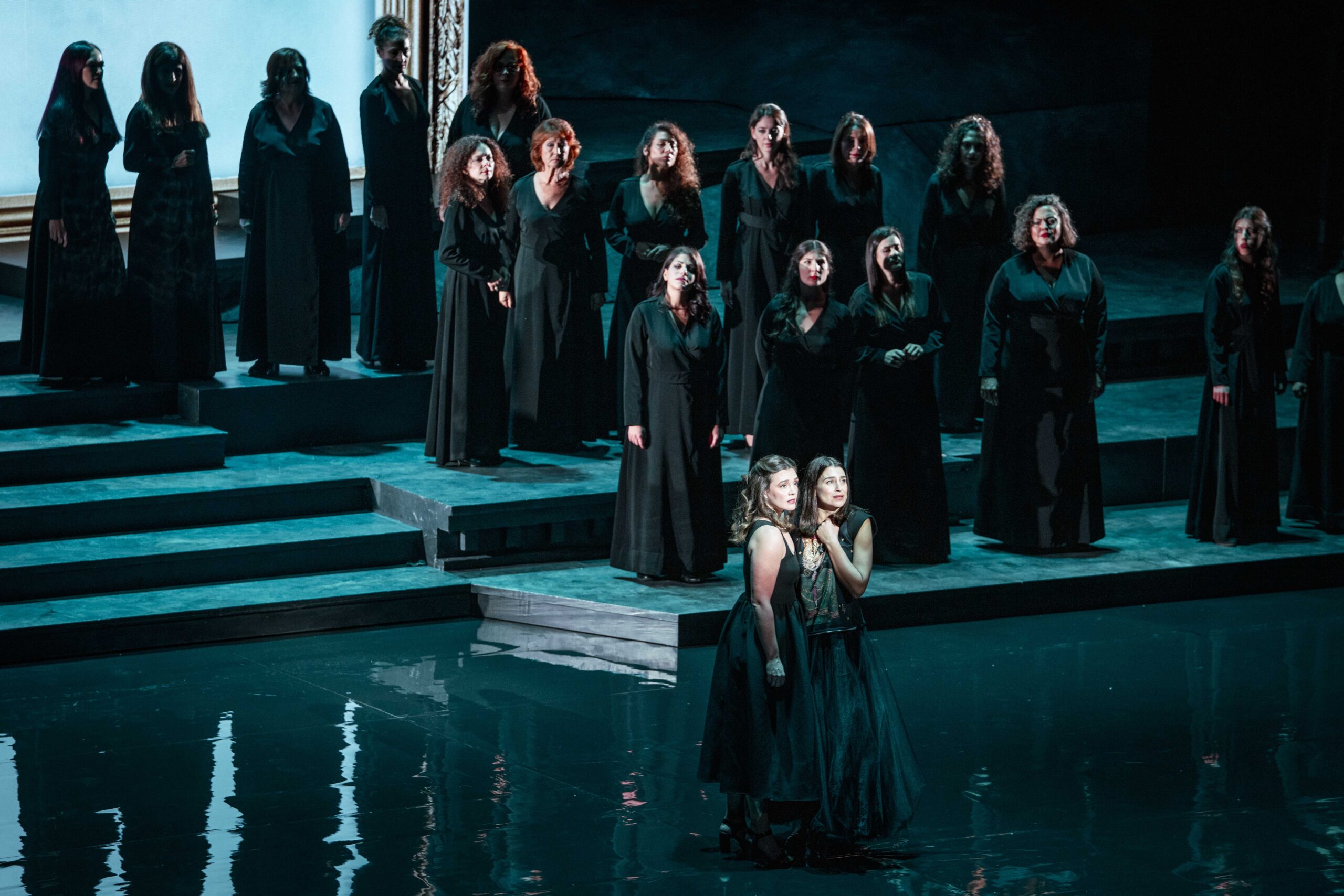 Dès le lever de rideau de l’acte II, on ne sera pas surpris de lire que toute la lumière est soudain captée par son personnage : assise à l’avant-scène, vêtue d’un tee-shirt orné dans sa partie centrale de la représentation naïve d’un…pirate, perdue dans ses pensées, la soprano lituanienne – qui n’avait plus chanté le rôle depuis la production de Dimitri Tcherniakov pour Bayreuth, en 2021 – donne à voir, avant même d’ouvrir la bouche, la figure d’une jeune fille décidée, au regard pénétrant, relativement étrangère à ses camarades fileuses et à son environnement direct (Mary, Erik, Daland), même s’il y a davantage à l’égard de ce dernier un détachement bienveillant, quelquefois offusqué, qu’une franche hostilité… . Irrésistiblement, en voyant apparaître cette Senta en teenager inconsciente et généreuse dans ses gestes, on pense à Anja Silja, incarnation idéale du personnage, jadis, sous la houlette de Wieland Wagner… .