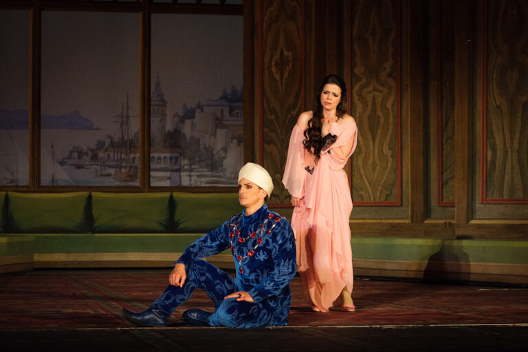 L’ambiance du Regio est évidemment tout autre : les dimensions, les matériaux et le style architectural sont différents. Ce qui à Versailles était un projet parfaitement cohérent avec le lieu, dans la salle de Mollin, révèle une certaine étrangeté et s’apparente à une reconstruction muséale, agréable mais sans plus. Le décor est pratiquement unique : une passerelle mobile, des coulisses et un plafond qui s’abaisse définissent les différents espaces. Il n’y a aucune trace des prodigieuses machines scéniques baroques encore en fonction dans la salle de Versailles. À cela s’ajoute une mise en scène – reprise par Tristan Gouaillier – qu’il est euphémique de qualifier de sobre, dépourvue idée forte. Même une œuvre apparemment simple comme celle-ci peut se prêter à une lecture forte – comme celle de Christof Loy au Liceu de Barcelone en 2010 ou de McVicar à Glyndebourne cinq ans plus tard. Après une première partie plutôt plate du point de vue de la mise en scène – les trois actes sont ici divisés de manière un peu incongrue en deux –, la seconde offre quelques éléments supplémentaires, jusqu’au dénouement avec la « béatification » du magnanime Selim, qui s’envole sur un tapis volant. Pour le reste, le jeu des acteurs souffre du problème du singspiel : de longs passages récités en allemand (à Versailles, ils étaient en français) par des interprètes qui ne semblent pas faire preuve de grandes capacités d’acteur ; même le seul acteur de la troupe, Sebastian Wendelin, ne parvient pas à dessiner un Selim mémorable.