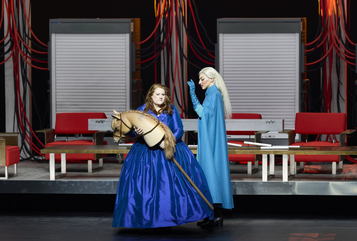 L’autre atout du spectacle réside dans sa direction d’acteur, qui fourmille d’inventivité et de détails inattendus : d’emblée le personnage de Sieglinde apparaît comme une femme-enfant aux gestes hagards et craintifs, tandis que son mari brutal affiche une puissance viriliste ostentatoire. De même, Brünnhilde se montre tout aussi peu évoluée face à son père, promenant son cheval de bois lors de son entrée, en signe d’immaturité. Son affirmation face à Wotan n’en sera que plus incisive, tant l’ambiguïté de leur rapprochement physique fait froid dans le dos : si Wotan ne s’offusque pas d’une union incestueuse entre ses propres enfants, pourquoi refuserait-il de l’envisager pour lui-même et sa fille ? Seule la dernière partie du spectacle se montre un cran en dessous, tant les intentions scéniques deviennent plus nébuleuses, notamment avec l’intervention rocambolesque des Walkyries dans les airs, puis leur ramassage de cadavres épars.