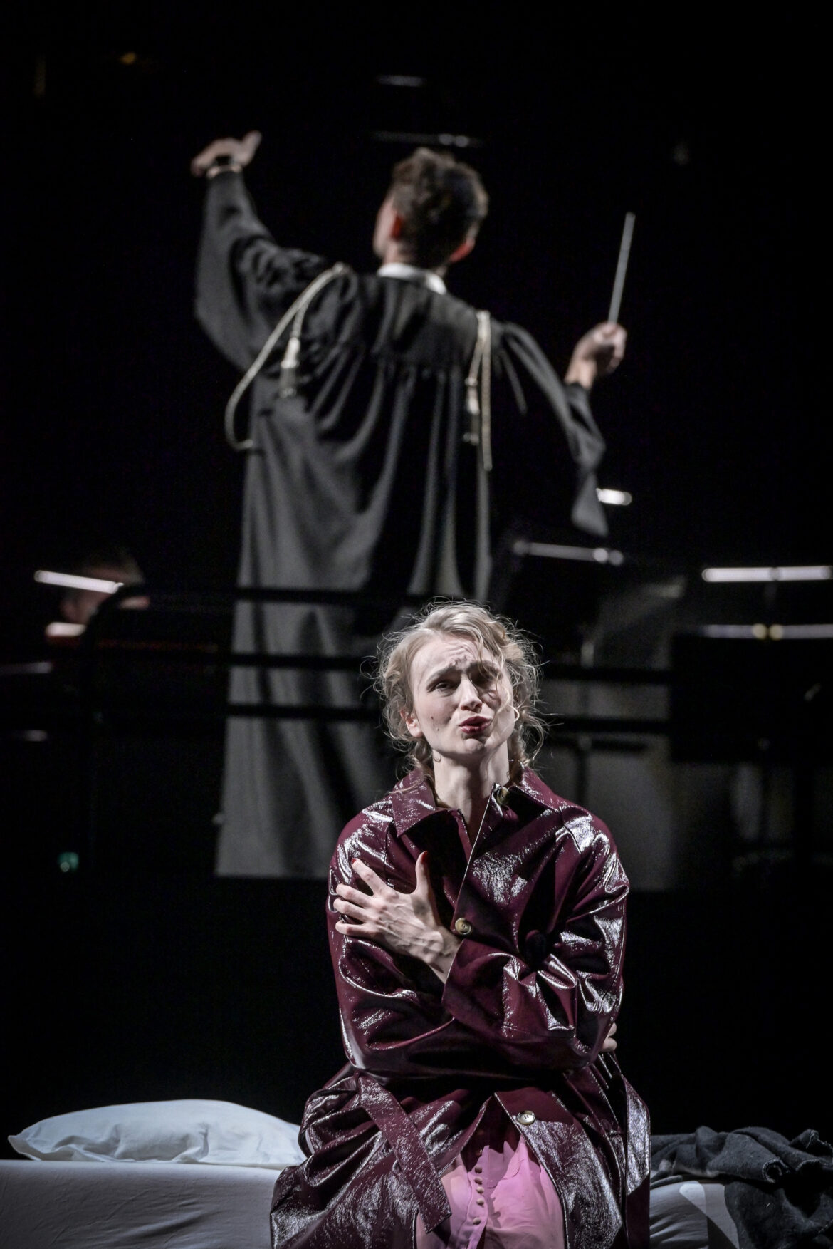 Qu’elle est vide cette scène ! Le premier acte surprend par un manque de cohérence ou de ligne directrice claire. Du romantisme échevelé et de la musique évocatrice à la fois des bruits de la ville, des chœurs d’étudiants, des tavernes, et de la présence diffuse des esprits de la nature aussi bien malfaisants que séducteurs, rien ne transparaît dans la scénographie. La musique romantique à la fureur évocatrice se retrouve face à une scène désespérément vide, hormis l’arrivée brumeuse des esprits… avec des costumes sortis d’une production artisanale de Dune…. Ce qui aurait pu renforcer l’élan créé par la musique enflammée de Berlioz, ç’aurait été de prendre l’idée à contresens : à savoir montrer l’isolement et le sentiment de solitude de Faust, confinant à la folie, dans une scène vide… un Faust revenant progressivement à la vie… Rien de tout cela ici. La scène reste aux 3/4 vide avec des meubles peu à peu dévoilés, puis recouverts de tissus avant d’être déplacés pour illustrer les changements de lieux. L’apparition de Marguerite sous une cape noire, dont au départ seules les jambes nues sont visibles, rappelle une esthétique très 70s de films de Jean Rollin, qui lui-même affichait un gothisme très pulp. Mais là encore il ne s’agira que d’un potentiel non exploité, non suivi d’effet.