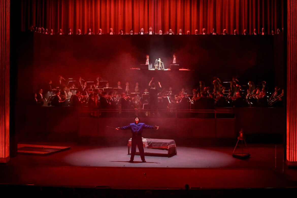 Si le 2e acte demeure mieux conçu, il est déjà malheureusement trop tard. Pourtant on y découvre au moins une bonne idée, comme l’incarcération de Marguerite à la fin de sa belle romance “D’amour l’ardente flamme…” et le chœur revêtant les habits de magistrats pour mieux illustrer sa condamnation à mort – une condamnation qui n’est qu’évoquée par Méphisto dans le livret. La course vers les enfers avec un Faust descendant dans la fosse vidée de l’Orchestre, qui lui a déménagé sur scène pendant l’entracte, est aussi assez originale, mais n’aurait-elle pas pu avoir lieu plus tôt ? Et quid de ces bouts d’armure médiévale quand Mephisto lui, est habillé comme un extra-terrestre de la série “V” ? Ou de ces costumes façon crayons de couleur rouge illustrant les esprits ?