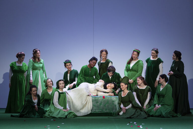 La scénographie de Stéphane Braunschweig repose sur une beauté plastique indéniable. Un vaste cube clair, traversé de rais de lumière, posé sur un sol vert évoque un jardin intérieur ou une clairière mentale. Les suivantes, en robes médiévales vertes, composent une communauté protectrice autour de Iolanta, dont le blanc concentre et renvoie la lumière. À l’opposé, les hommes de pouvoir surgissent en costumes modernes, depuis la salle. Une intrusion volontaire du réel dans l’espace mental de la jeune femme. Ce contraste, très construit, crée un trouble fécond… mais un trouble qui ne mène pas toujours à une lecture claire.