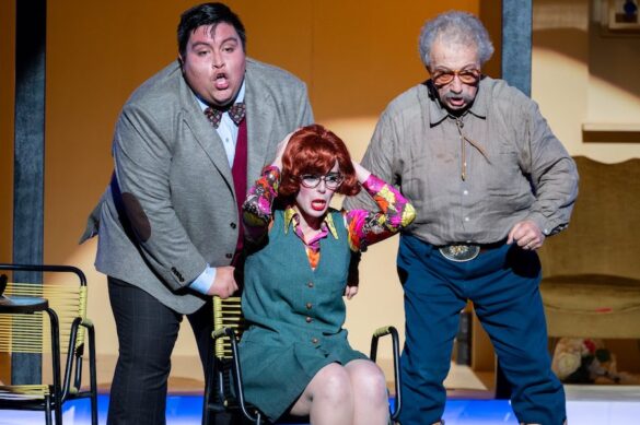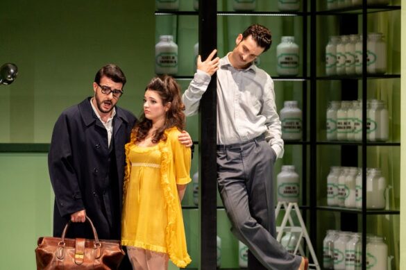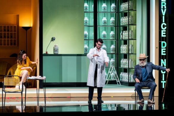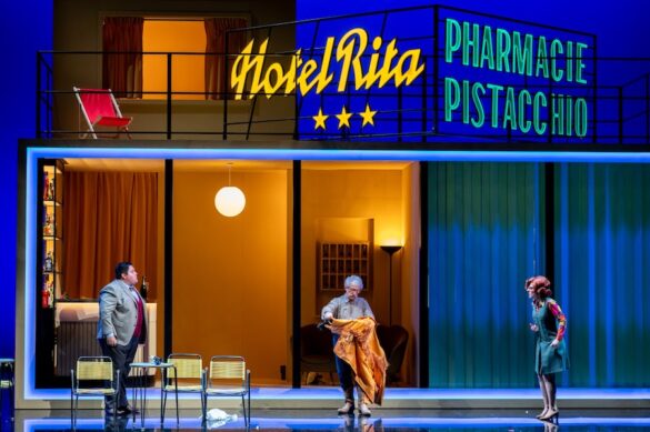 La mise en scène de Stefania Bonfadelli unit les deux actes uniques : les situations sont en quelque sorte symétriques, les personnages de l’un se retrouvent dans l’autre. L’humour n’est pas obtenu par une caricature facile des personnages, mais par l’imbrication précise des situations dans le parallélisme des deux mariages. La scénographie fonctionnelle et visuellement remarquable de Serena Rocco juxtapose la pharmacie d’Annibale Pistacchio (Il campanello) à l’auberge trois étoiles de Séraphine (Deux hommes et une femme). Les costumes colorés des années 60 de Valeria Donata Bettella et les lumières de Fiammetta Baldiserri recréent un univers savoureusement caractérisé par le cinéma du boom italien, dans lequel les personnages et les choristes s’immergent avec amusement. Tous font preuve d’un jeu spontané et fluide, avec des gags et des répliques très drôles.