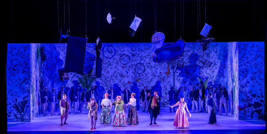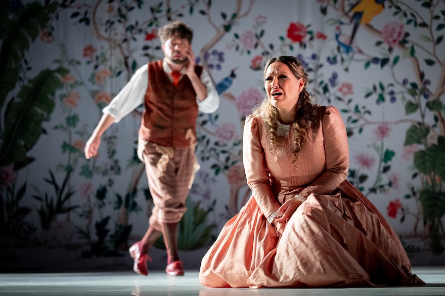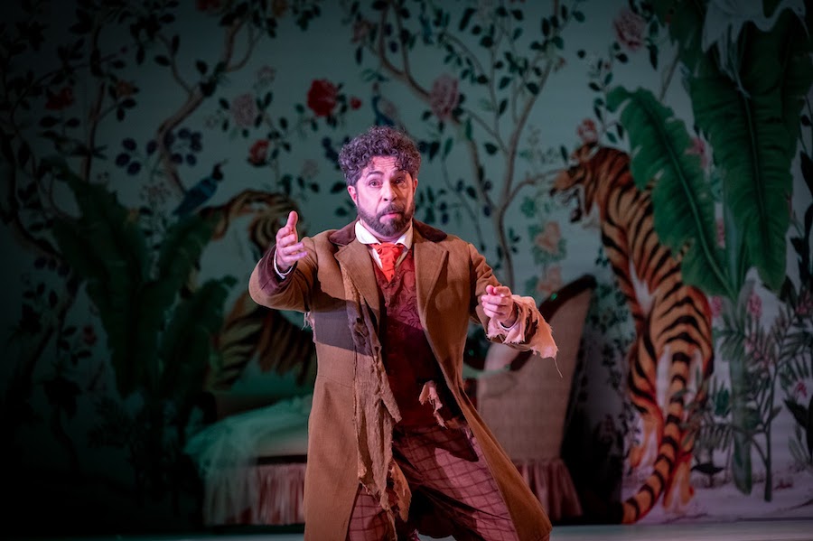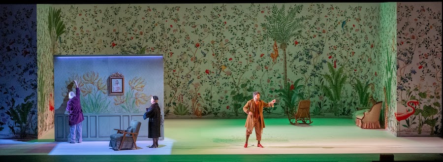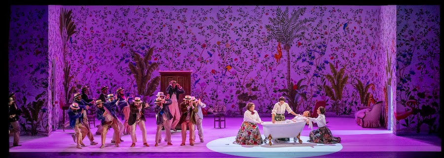 Dans la mise en scène de Manuel Renga, Fernando ne descend pas d’un navire mais sort d’un placard : l’effet est néanmoins théâtralement efficace. Le metteur en scène originaire de Brescia évoque les Caraïbes sur les murs de la scène unique – qui fait cependant l’objet de variations visuelles avec beaucoup d’inventivité – en s’inspirant des décorations exotiques des demeures du XVIIIe siècle de Bergame Alta. Palmiers, bananiers, fougères, cactus, oiseaux, tous dans des tons rose, bleu ciel et émeraude, se succèdent dans les décors d’Aurelio Colombo, qui signe également les costumes, amusants et colorés.