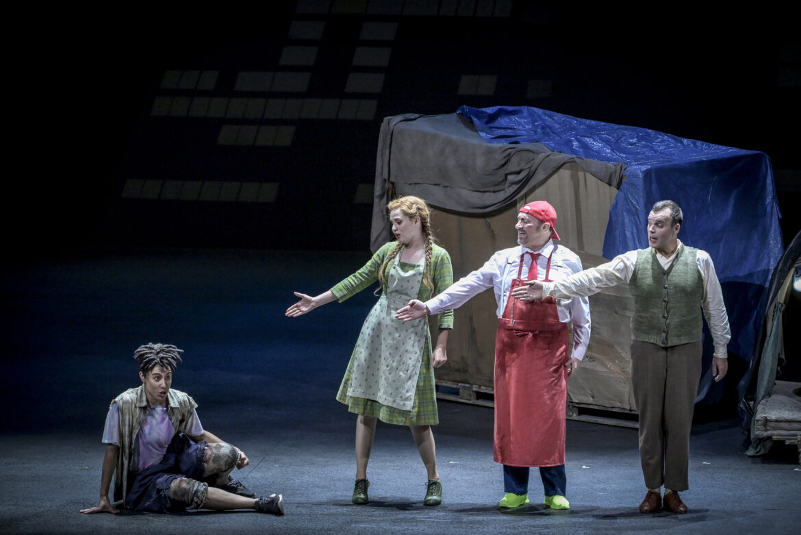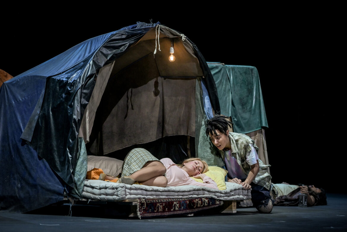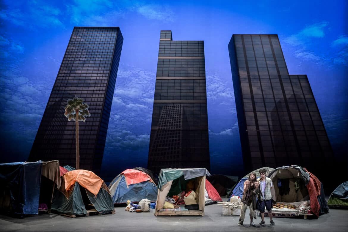 Laurent Pelly, secondé à la dramaturgie par Agathe Mélinand, poursuit ici son exploration du monde d’Offenbach après une longue série de succès (Orphée aux Enfers, La Belle Hélène, La Grande-Duchesse de Gérolstein, Barbe-Bleue, La Périchole,,…). L’idée plutôt attendue d’une transposition au XXᵉ siècle s’avère globalement convaincante : Robinson n’est plus un naufragé des mers mais un naufragé social, immigré solitaire dont les rêves d’ailleurs se fracassent contre l’indifférence d’une grande métropole américaine. Le parallèle dramaturgique fonctionne : l’île déserte devient une rangée de tentes de sans-abris au pied des skyscrapers, Vendredi un émigré marginalisé d’origine hispanique, et les “sauvages” d’antan des figures contemporaines du conformisme brutal ou de l’incivilité.
