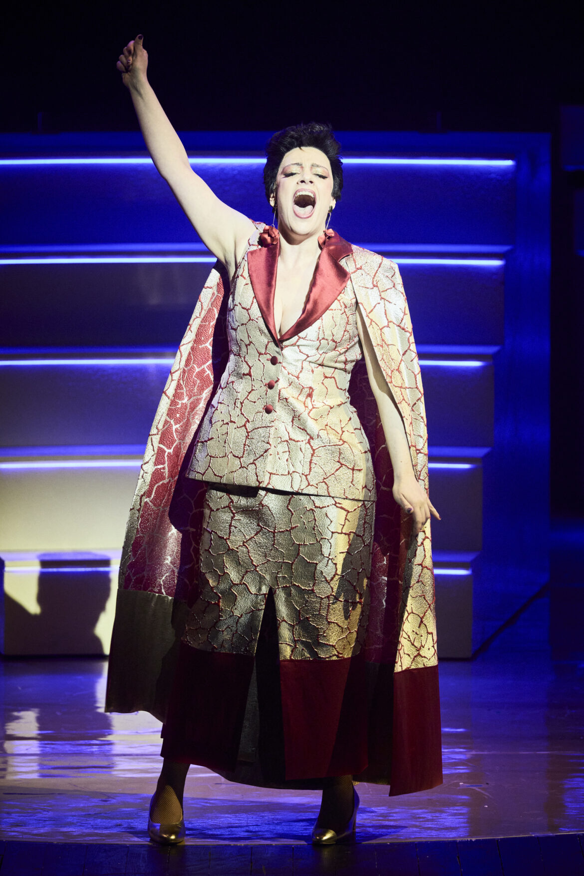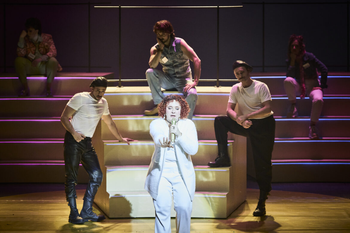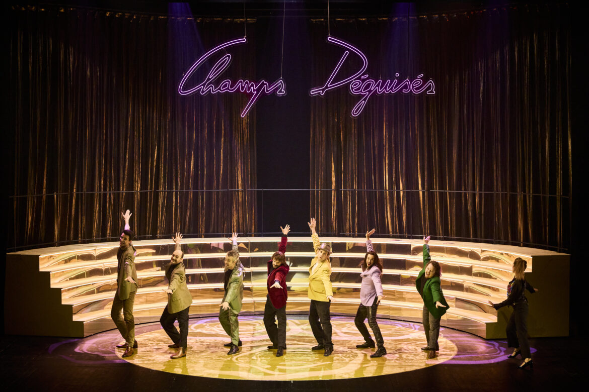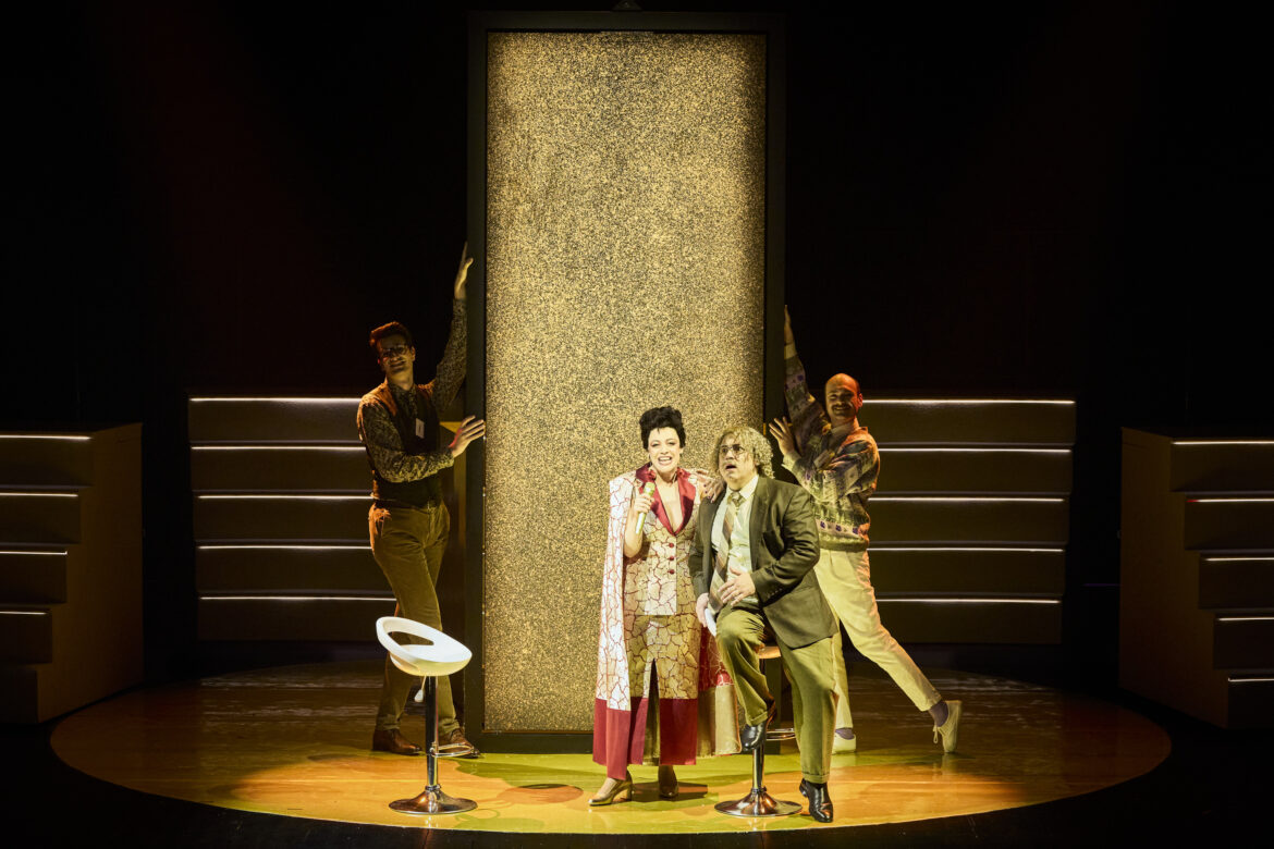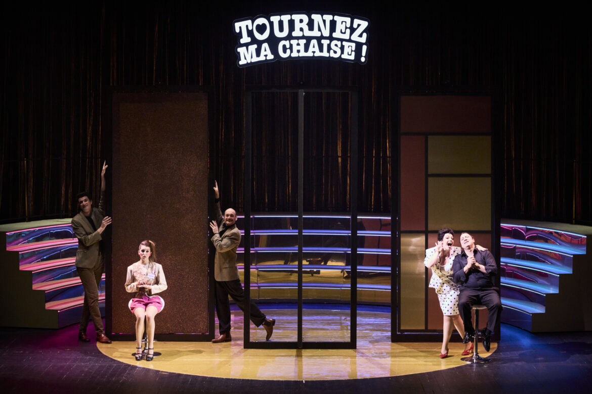 Oria Puppo propose, au-delà des gradins évoquant les plateaux de jeux, des éléments scénographiques inattendus, comme ce panneau lumineux indiquant des consignes au public et animant des images en lien direct avec les paroles chantées et les scènes jouées. Les costumes de Sabine Schlemmer, les coiffures et maquillages de Maurine Baldassari, ainsi que les lumières de Simon Demeslay, s’accordent avec jubilation pour faire (re)vivre cet univers ludique. Enfin, le chef Sammy El Ghadab s’impose comme un remarquable coordinateur : il dirige avec précision un orchestre — dont les musiciens sont habillés comme des mesdames et messieurs tout-le-monde, à l’image du public de ces émissions — et des chanteurs soumis à des déplacements constants, dans des numéros demandant une rigueur extrême.