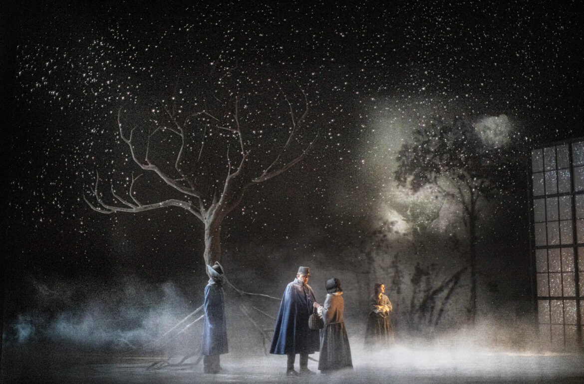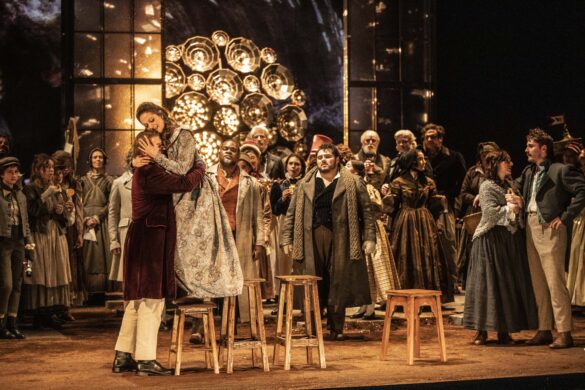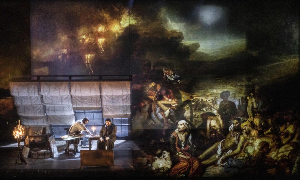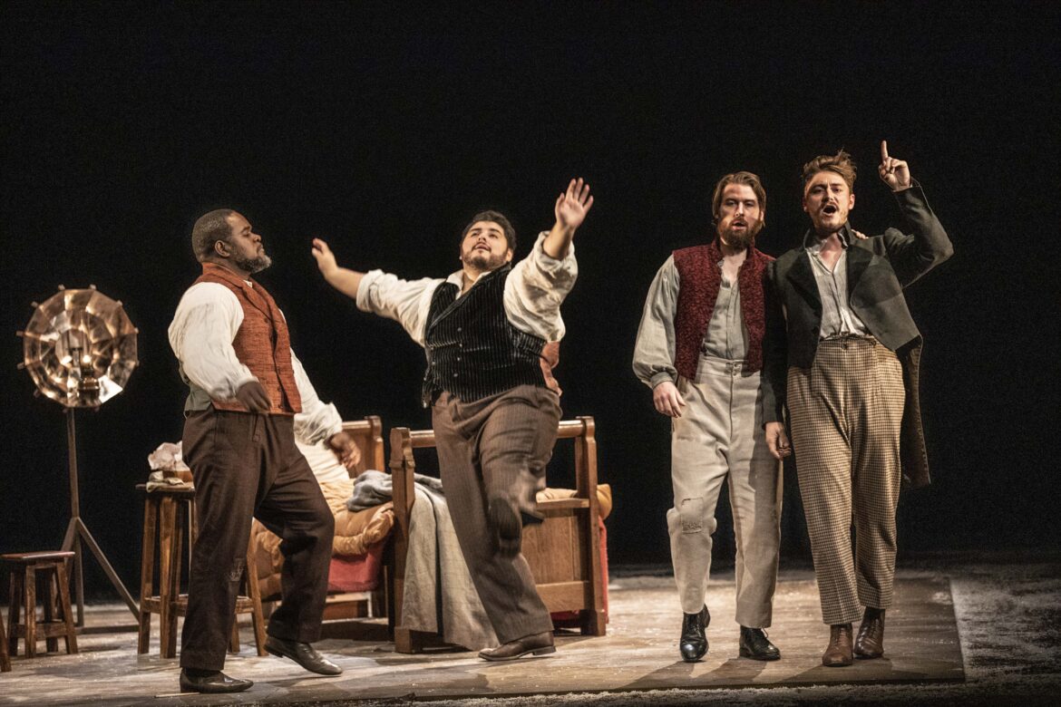 L’idée est aussi simple que séduisante : dans cet opéra dont les protagonistes masculins sont un peintre, un poète, un philosophe et un musicien, pourquoi ne pas offrir aux arts et aux lettres la place qui leur revient de droit ? Tel est le pari tenu par l’équipe du comédien David Geselson qui, pour sa première mise en scène opératique, immerge la Bohème dans le bouillonnement artistique et intellectuel du Paris des années 1830 – loin des cratères lunaires de Claus Guth à Bastille, donc. Le prologue – habillé par l’orchestration des Crisantemi de Puccini – place d’emblée la lecture de l’œuvre dans cette perspective cinématographique si naturellement rattachée au Maestro de Lucques. Un texte de remise en contexte pédagogique (façon « En ces temps-là, en Galilée… » cher aux péplums bibliques) s’affiche sur un rideau translucide à l’avant-scène, situant justement l’action de l’opéra au mitan de deux révolutions et de deux rois – l’un de droit divin, l’autre choisi par le peuple. Comme pour mieux fusionner musique, drame, histoire et peinture, le rideau accueille aussi un détail des Scènes des massacres de Scio de Delacroix, toile qui sera maintenue pendant tout le premier tableau. Derrière elle, une vaste verrière figure la mansarde mal chauffée de notre quatuor d’artistes. Parti-pris déroutant – on redoute un effet de mise à distance – mais finalement convaincant, qui inscrit le mélodrame domestique dans la trame plus vaste de l’Histoire. Les autres œuvres dispensées au fil des scènes (Goya, Turner, Hugo, Vernet…) produiront habilement le même effet. Le second tableau voit le rideau translucide se lever et la verrière basculer pour figurer la devanture du Café Momus. Cette fois, plus de mise à distance : avec une euphorie communicative, le plateau est pris d’assaut, les membres du chœur déferlent de toutes parts (dans les magnifiques costumes de Benjamin Moreau) et brisent joyeusement le quatrième mur pour communiquer avec le public, jusqu’à un lancer de tracts reprenant la Déclaration des Droits de la Femme et de la Citoyenne d’Olympe de Gouges. Une effervescence parfaitement maîtrisée, jusque dans la lisibilité des micro-actions (Parpignol et ses jouets, la Retraite…). L’effet de contraste est saisissant avec les deux derniers tableaux où, en écho aux vers baudelairiens projetés comme des commentaires de l’action, les lumières mordorées et la flamboyance des œuvres romantiques s’atténuent pour évoluer vers des visions spleenétiques et hivernales. La désolation brumeuse de la Barrière d’Enfer préfigure le retour à la mansarde glacée où Mimi pousse son dernier soupir, avec ce beau motif d’un arbre aux racines dénudées ; la réapparition des choristes, silhouettes éclairées à la bougie, autour de son lit de douleur évoque quelque assemblée de spectres… Quand le noir se fait sur l’ultime cri poussé par Rodolfo, c’est un magnifique livre d’images qui se referme.