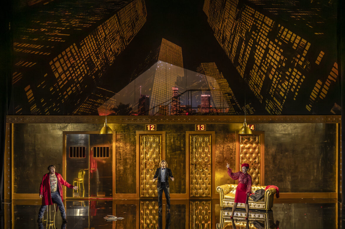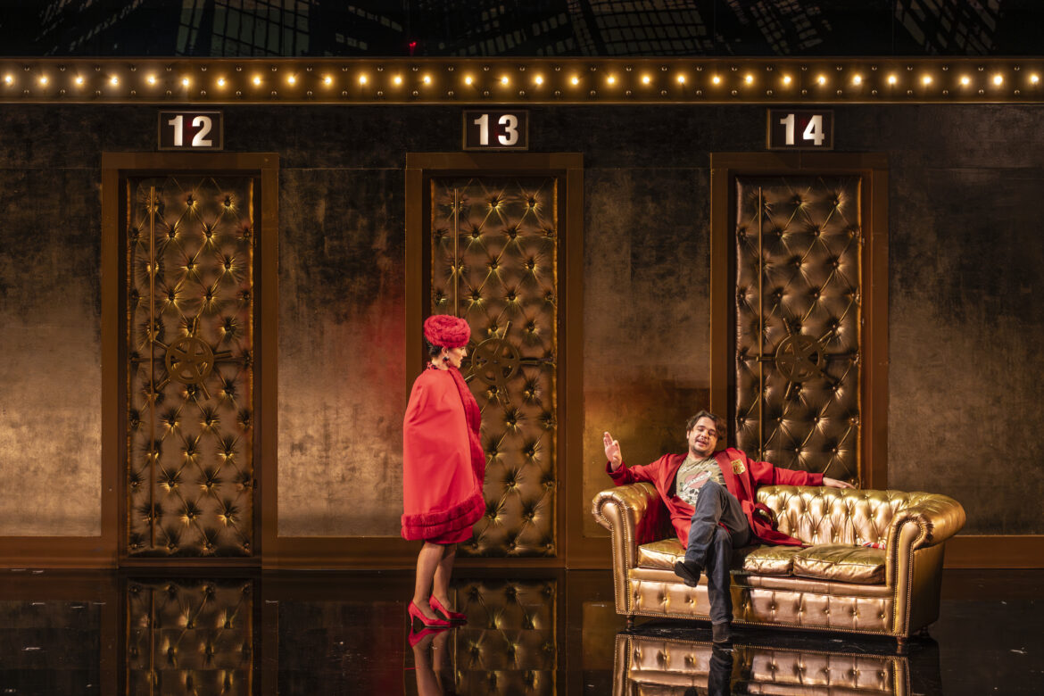 Le troisième acte, traditionnellement le plus délicat à réussir en raison de son caractère plus statique et d’une inspiration musicale parfois jugée moindre, s’avère ici étonnamment efficace. Exit le long monologue de Frosch : à la place, une scène très drôle où « Ivan », la drag queen, se change derrière un paravent pour revenir… métamorphosée en gardien de prison ! Une prison dorée, au sens propre, réservée aux VIP, où portes et cellules capitonnées sont recouvertes de tissus dorés d’un luxe ostentatoire.