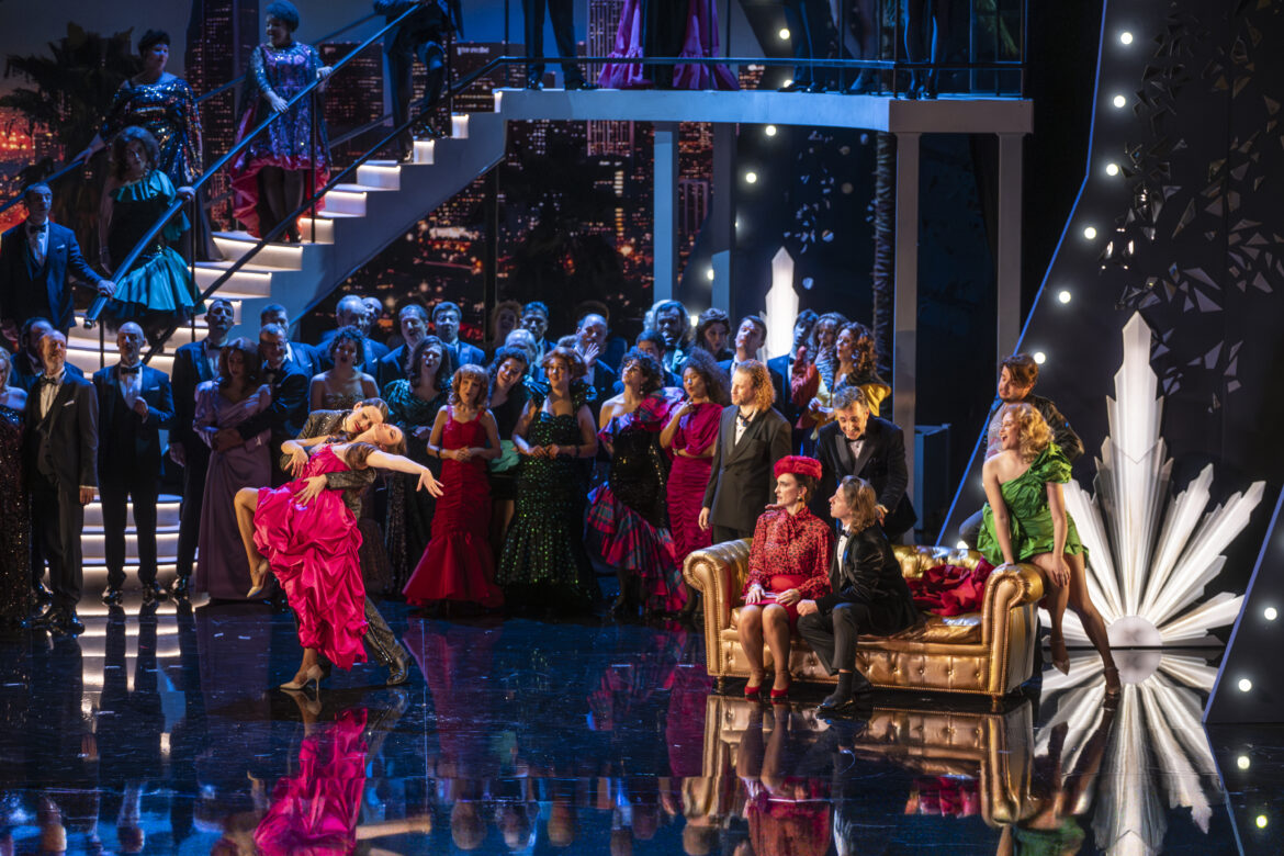 Alors que les célébrations du bicentenaire de Johann Strauss fils sont passées presque inaperçues en France, c’est en Belgique qu’il fallait se rendre pour honorer dignement le roi de la valse. L’Opéra Royal de Wallonie-Liège propose en effet pour les fêtes une Chauve-Souris aussi jubilatoire qu’inventive. La mise en scène d’Olivier Lepelletier-Leeds, dont il avait dévoilé les intentions dans une interview accordée à Première Loge, repose sur une idée à la fois claire, cohérente et particulièrement réjouissante : transposer l’action dans le Hollywood des années 1980. Les Eisenstein deviennent ainsi une richissime famille américaine, vivant dans une villa luxueuse de Sunset Boulevard. Rosalinde insiste d’ailleurs sur le fait qu’elle n’aurait pas supporté que son amant Alfred la voie vivre dans la misère – détail qui prend ici tout son sens. Rebaptisés Rosy et Gaby, les héros évoquent ainsi ouvertement les Carrington de la série Dynastie.