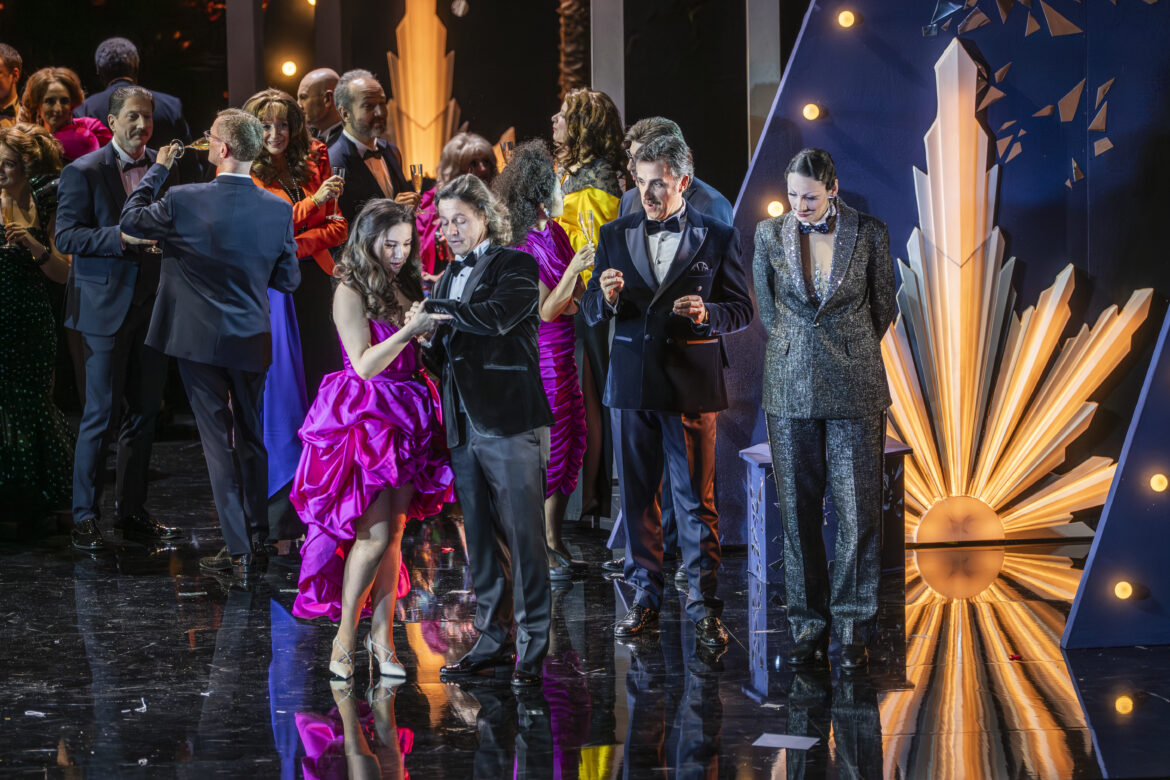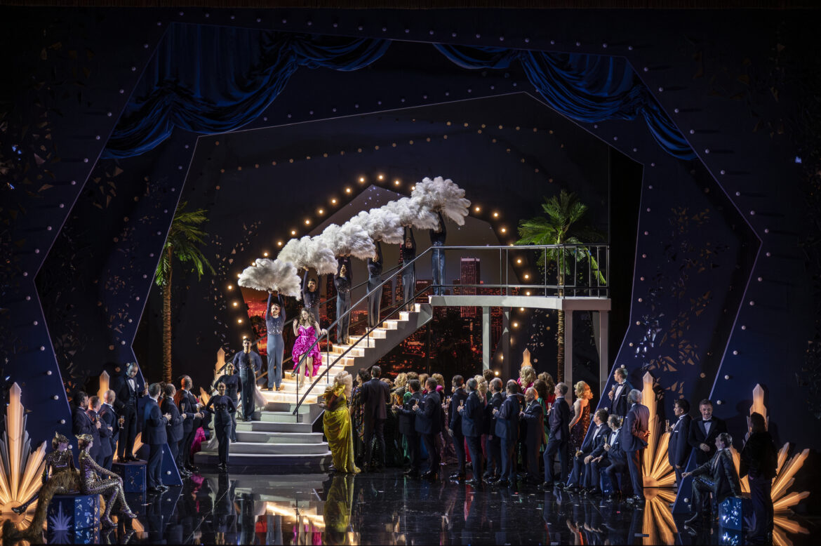 La réussite de l’acte II doit aussi beaucoup à la chorégraphie de Carmine des Amicis, absolument irrésistible par son enjouement, son entrain, son impertinence. Déjantée mais impeccablement réglée, elle s’intègre avec un naturel remarquable à la narration, ce qui était déjà perceptible dès le premier acte, notamment lors de l’irruption désopilante de grooms, évoquant ceux de la série Palace des années 1980. Les costumes de David Bélugou participent eux aussi pleinement à cette réussite visuelle, qu’il s’agisse du chic guindé de la famille Eisenstein ou de l’atmosphère cabaret du bal chez Orlofsky. Car Olivier Lepelletier-Leeds exploite pleinement ce deuxième acte pour convoquer l’univers du cabaret, qu’il connaît intimement en tant que régisseur général du Moulin Rouge. Certains tableaux sont particulièrement mémorables, tel l’air d’Adèle descendant un grand escalier à la manière d’une meneuse de revue, entourée de boys faisant surgir derrière elle de grandes plumes blanches.