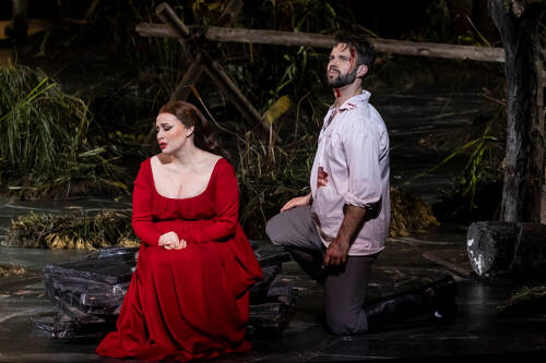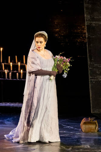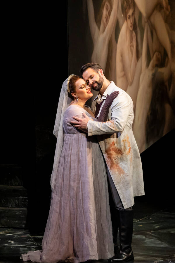 Nous avions déjà recensé la Floria de la cantatrice russe à l’été 2024. Nous nous réjouissions de la réentendre dans des conditions plus traditionnelles que celles qu’offre le plein air des Arènes de Vérone. C’est par une extrême douceur qu’Elena Stikhina conçoit son personnage et ce, dès son appel dans les coulisses : « Mario! Mario! Mario! ». Son irruption dans l’église Sant’Andrea della Valle se distingue ainsi par les enchaînements intelligents des harmoniques, tandis que l’affrontement avec le Scarpia d’Alexei Markov – en plus petite forme qu’en novembre – s’engage d’abord sur des tons émoussés pour s’épanouir ensuite dans le crescendo des aveux. Couronnant son air d’un lyrisme très intimiste, elle sait aisément monter vers la partie haute du registre sans donner de signes perceptibles d’effort. Lors des retrouvailles avec son amant, relevons la belle note prolongée qui darde comme un stylet, de manière à signifier le poignard ayant frappé son tortionnaire. Une belle entente s’établit alors avec son partenaire qui n’hésite pas à recourir au bon vieil expédient de lui serrer la main, bien que le chant partagé ne le justifie pas forcément. Dommage que dans l’épilogue on perçoive comme une légère hâte de conclure : « Com’è bello / il mio Mario! » est mal articulé, de même que le rendez-vous à l’adresse de Scarpia sonne savonné. En cela l’interprète n’est probablement pas aidée par la direction nerveuse d’Oksana Lyniv.