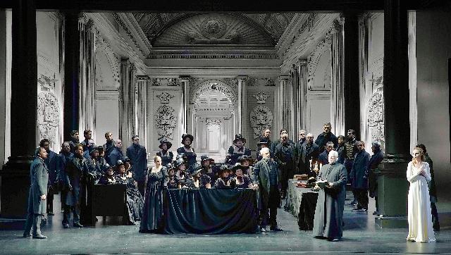La regia di Pier Luigi Pizzi è elegante ed essenziale, rispettosa del libretto e tutta giocata sul bianco e nero. Massimo Gasparon – che è laureato in architettura sia a Venezia che a Londra – crea effetti prospettici e giochi di luce straordinari. I costumi sono curatissimi, seppure semplici e quasi tutti in nero (con l’unica eccezione di Lina che inizialmente indossa una candida veste), i tessuti assumono talora lievi sfumature iridescenti e bluastre per effetto delle luci. Nel finale, una luce bianchissima inonda il fondale neoclassico della chiesa, dissolvendo suggestivamente ogni contorno.