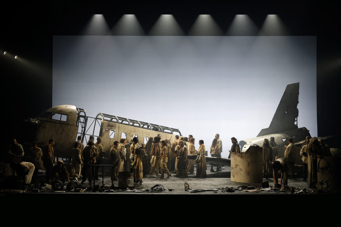 Le choix de David Bobée est spectaculaire en exposant d’emblée la catastrophe : une carcasse d’avion fracassé accueille le public. Nous sommes après la chute. Les membres du chœur, blessés, sortent de la carlingue dans la douleur. Et les premières notes ne sont que bruits amplifiés de celle-ci, avant un chaos sonore qui cède progressivement la place à un silence bientôt traversé par un frêle accordéon semblant venir de nulle part et introduisant à un choral de Bach chanté à voix seule par le baryton. Ainsi, avant plusieurs des sept parties du Requiem, ces sonorités du si subtil accordéon de Franck Krawczyk s’insèrent avec une évidence désolée en soutien aux autres chorals comme aux berceuses de Brahms enchâssés. À chaque fois, le tuilage qui enchaîne avec l’œuvre elle-même relève du grand art.