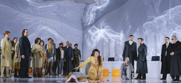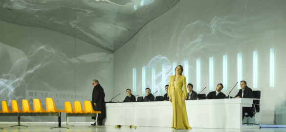 Venue d’Amsterdam, la production de Jakob Peters-Messer choisit la carte de l’épure, écartant toute référence à la légende médiévale pour mieux souligner la portée universelle du message, même si ici ou là, des références plus contemporaines s’interfèrent, comme la salle du procès et ses sièges orange qui rappellent celle de la bande à Baader qui défraya la chronique en Allemagne de l’Ouest. Sur scène, le blanc domine, avec un impressionnant plafond en miroir ondulé qui reflète avec succès les lumières changeantes de Guido Petzold – qui signe également les décors, minimalistes, et la vidéo –, en fonction des péripéties du drame. La figure de l’Étranger qui sème le trouble, comme le héros pasolinien de Théorème, est lui aussi traversé par de nombreuses références religieuses, en particulier le Christ mort de Mantegna, dans sa position allongée sur scène, mais aussi projetée en vidéo sur les murs blancs. Si l’on peut en revanche être agacée par l’omniprésence de la figure de l’ange, danseuse en jogging dont l’apport dramaturgique relève de la cosmétique, le tableau final qui voit les parois s’ouvrir pour laisser passer une lumière aveuglante, restera comme l’un des plus beaux moments de la production.