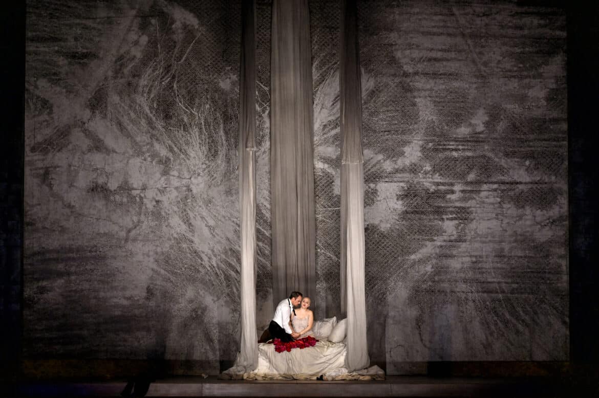 Face à elle, Germont apparaît froid, presque indifférent. Le duo de l’acte II devrait être une lente démolition. On ne la sent pas. Lucas Meachem est vocalement solide, même si quelques accents surprennent, avec un « Di Provenza » un peu bousculé, et une raideur scénique qui n’aide pas à densifier l’enjeu humain. Alfredo, amoureux immature, reste également en surface. Julien Behr dont on connaît pourtant la grande capacité d’incarnation manque parfois de puissance et semble même perdu scéniquement. Les seconds rôles sont très bien tenus, avec une Flora de Marine Chagnon remarquablement campée, et une Annina sobre de Jingchao Wu. Rien à redire sur la tenue musicale, visuellement, tout est propre, beau et efficace. Mais La Traviata ne se résume pas à une réussite. Elle doit brûler. Ici, elle brille seulement. Et c’est précisément le problème.