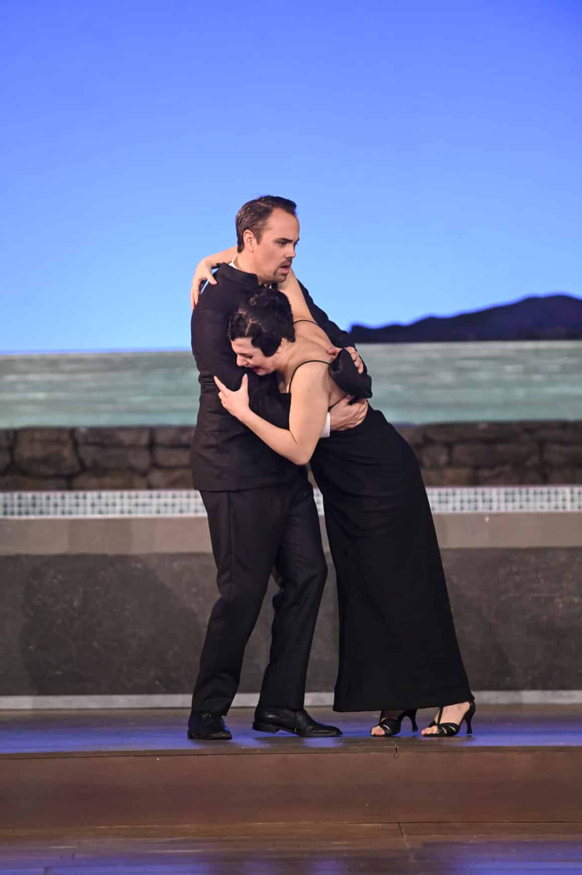 La fosse, elle, devrait être le nerf de l’action. Tito Ceccherini propose une lecture confortable, précise, maîtrisée, qui sécurise la mise en place et favorise la netteté des attaques. L’Orchestre National Bordeaux Aquitaine est magnifique, mais cette beauté reste souvent décorative, peu dramatique. Et on a parfois l’impression que le chef contient les chanteurs plutôt qu’il ne les libère. Le résultat est propre, mais rarement emporté. Cela manque d’allant, de bulles, de ce frémissement qui fait décoller la fête et qui rend ensuite la chute plus violente, à l’image de ce Brindisi initial, porté sans verre et sans champagne.