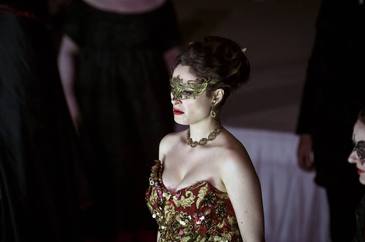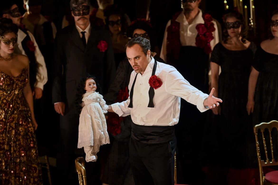 Ce manque de chair se voit aussi dans les interactions, étonnamment limitées, avec beaucoup de chant face public, ce qui freine la circulation des regards, des non-dits, des pressions. Les transitions de la fête à la solitude, du luxe au dépouillement, sont fluides mais ternes. On passe d’un tableau à l’autre sans que la température ne change. Quelques mécanismes de jeu interrogent parce qu’ils semblent posés comme des signes sans nécessité intérieure. La poupée apportée par Annina, double trop appuyé de Violetta, gêne plus qu’elle ne révèle. Violetta la reçoit, la manipule, sans que l’on sache quelle émotion guide le geste, et au dernier acte Alfredo ne sait pas davantage quoi en faire. Le symbole finit par se retourner contre la scène, devient un objet encombrant, presque un aveu de manque. Même impression avec certaines fleurs, prises et reposées sans qu’un mouvement intime soit lisible. On comprend l’idée, on ne sent pas la chair. La scène de l’humiliation, qui devrait être soit une explosion intime, soit une mécanique sociale écrasante, ne fait pas sentir le tribunal mondain. Les regards, le cercle, la cruauté collective restent pâles, et l’on se demande même pourquoi la poupée – encore elle – revient à ce moment-là.