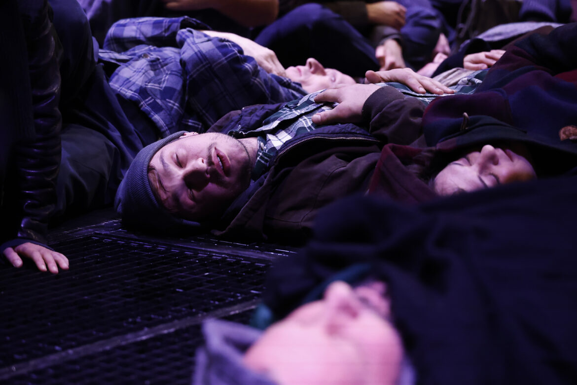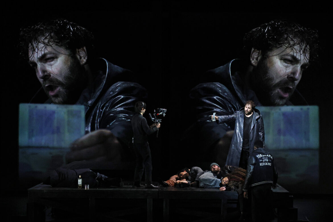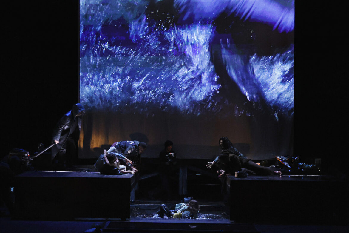 Dès l’ouverture, le cadre dramaturgique est posé : un groupe de migrants fait naufrage lors de sa traversée maritime. Certains périssent, d’autres survivent. L’embarcation roule et tangue ; les visages de ces passagers luttant contre les éléments sont filmés en direct et projetés sur un écran. Les chanteurs du Chœur accentus / Opéra de Normandie Rouen s’y révèlent d’excellents acteurs et actrices : la force de ces images, d’un réalisme saisissant, pourrait rivaliser avec celle de véritables documentaires. À la fin de l’ouverture, un petit groupe se détache de la masse, semblant former une famille, livide et accablée. Puis vient un saut dans le temps : l’action se situe vingt-huit ans plus tard.