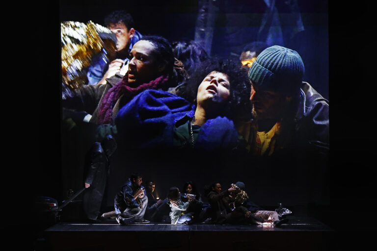 Dès l’ouverture, le cadre dramaturgique est posé : un groupe de migrants fait naufrage lors de sa traversée maritime. Certains périssent, d’autres survivent. L’embarcation roule et tangue ; les visages de ces passagers luttant contre les éléments sont filmés en direct et projetés sur un écran. Les chanteurs du Chœur accentus / Opéra de Normandie Rouen s’y révèlent d’excellents acteurs et actrices : la force de ces images, d’un réalisme saisissant, pourrait rivaliser avec celle de véritables documentaires. À la fin de l’ouverture, un petit groupe se détache de la masse, semblant former une famille, livide et accablée. Puis vient un saut dans le temps : l’action se situe vingt-huit ans plus tard.
