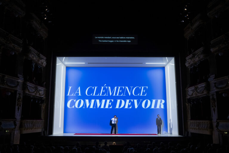 À force de cadrer l’image, le spectacle peine pourtant à laisser apparaître ce qui devrait se transformer. Et l’on se surprend à penser, mauvais jeu de mots assumé, à une salade niçoise : de beaux ingrédients, reconnaissables, bien disposés — le rouge, le blanc, le bleu, l’écran, le chœur de pancartes, la cérémonie et ses rituels — mais sans que la sauce prenne vraiment, sans que l’ensemble fasse sentir une progression intérieure, un chemin, une mue. Car l’évolution de Vitellia, justement, reste comme tenue à distance. Les vidéos montrent des moments de doute, des arrière-plans plus fragiles, des instants où l’on devine la fissure derrière la façade, mais ces aveux filmés semblent parallèles au plateau plutôt que creusés par lui. L’écran explique, commente, ajoute. La scène, elle, ne fait pas toujours le relais ; elle ne donne pas toujours le temps ni la nécessité qui feraient passer la Première Dame de l’icône à la femme, de la stratégie à la brûlure. Beaucoup de mouvement, d’accessoires, de techniciens, de changements de plateau, de fumée accaparent le spectateur et le perdent.
