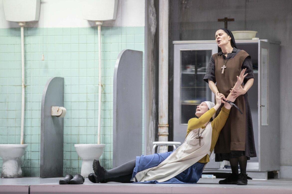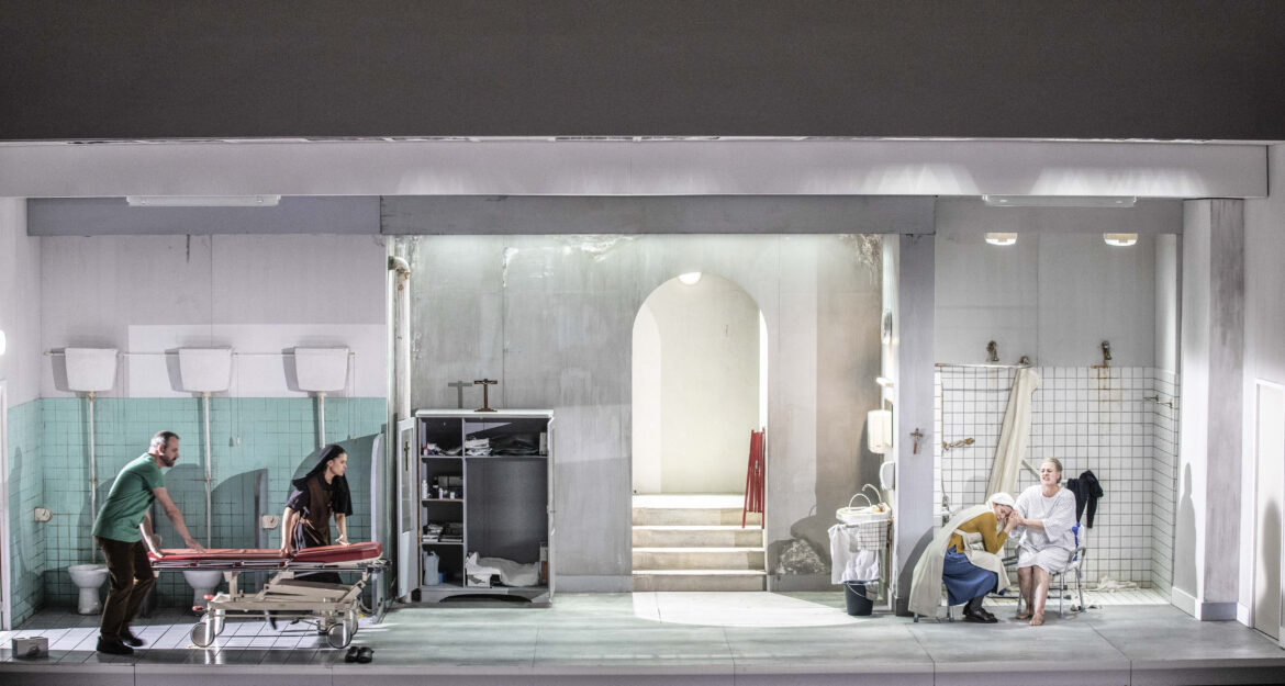 Il revient précisément à Helena Rasker d’incarner la première prieure – celle qui accueille Blanche au couvent dès le début des Dialogues. Elle ne figure que dans deux scènes mais avec une telle intensité qu’elle marque indiscutablement ce casting et rafle au rideau final une part substantielle des applaudissements de la foule. Dans la scène où elle interroge Blanche pour s’assurer qu’elle est suffisamment solide pour rejoindre le Carmel, le contralto hollandais délivre son texte avec une froideur tétanisante qui, loin de faire douter la novice, la fait se précipiter hors-du monde. Mais c’est dans la scène de l’agonie – où elle se confronte à la nuit de la foi – que l’interprétation de Helena Rasker se découple de son chant pour donner chair au refus d’un corps de se laisser happer par la mort. Faisant écho à la nudité de la voix de la chanteuse, la crudité du décor de sanitaires collectifs s’impose avec évidence et constitue l’un des sommets dramatiques de la représentation.